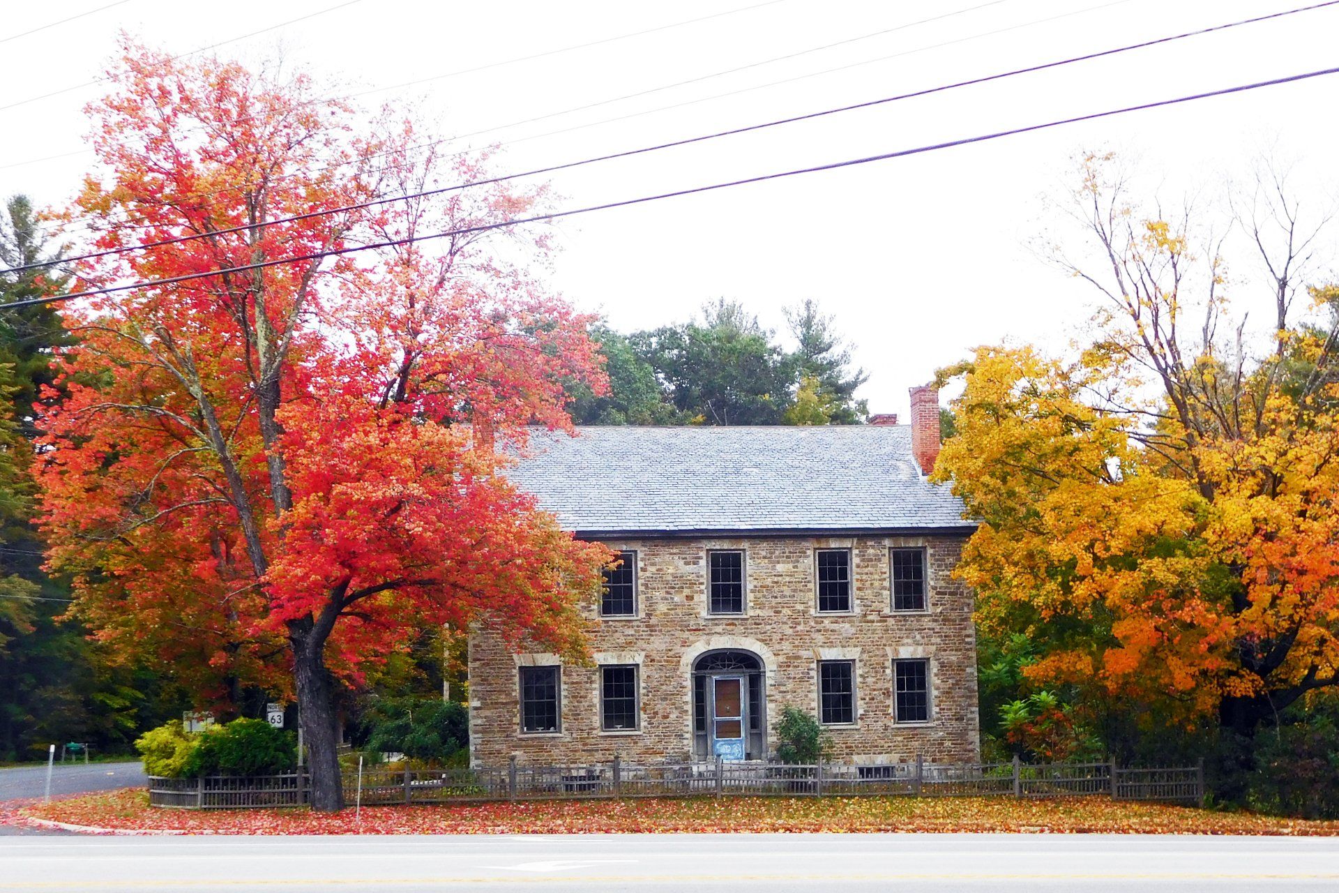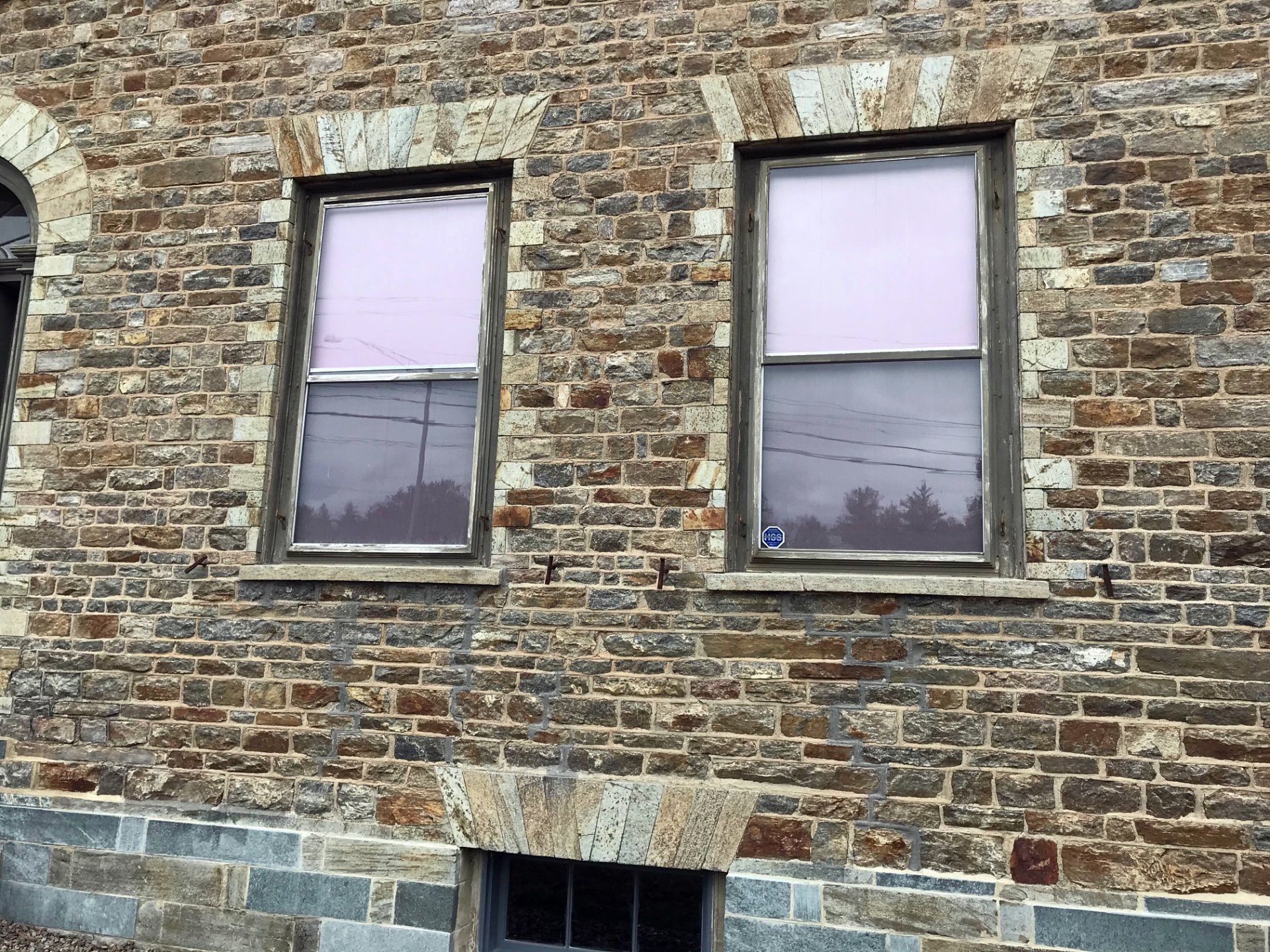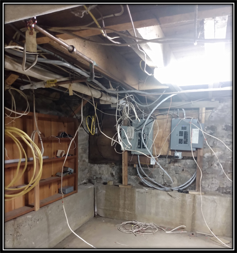 For 16 months construction continued until Phase 1 was completed. Chimneys were replaced with bricks/mortar appropriate for the time period, the slate roof was repaired (with new slates added as needed), the stonework was repointed, the exterior doors/windows were restored and repainted, new basement stairs were constructed, two basement windows were replaced, and, in the spring, the wooden gables and exterior trim were repaired and painted.