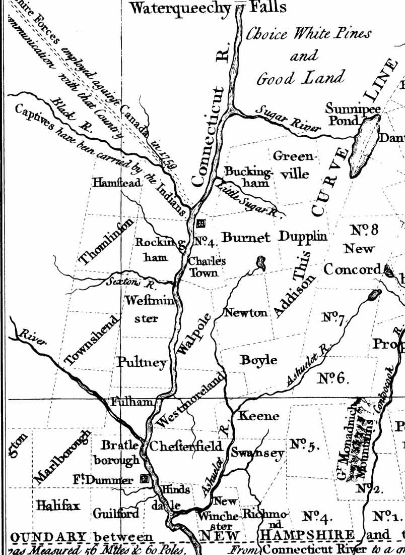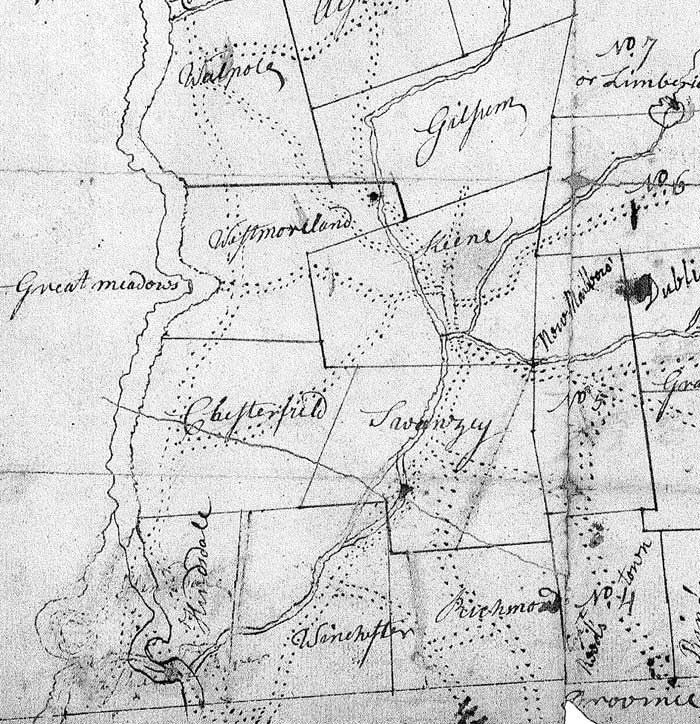 Also, note that Hinsdale is on both sides of the river, and that there are several new towns. On the west bank of the river are the new towns of Brattleborough, Guilford and Fulham (Dummerston). These towns were also chartered by New Hampshire in 1752. On the east side of the river, charters and some new names were given to the older settlements of Winchester, Swanzey and Keene.