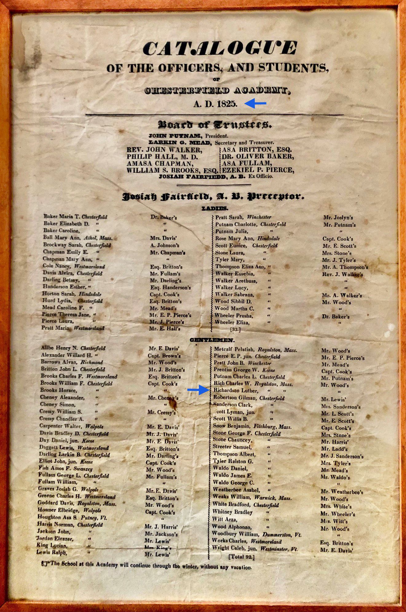 Established in 1790, Chesterfield Academy had an excellent reputation and was ranked second only to Phillips Academy. With no public secondary education available, those wishing to further their studies had to attend private schools. Chesterfield Academy was the first in the region and attracted 70 – 100 students who came from the local area, VT, and MA. Included in CHS archives, is the 1825 class Catalogue (roster). Listed among the 92 of Luther's fellow classmates are E.P. Pierce, Jr and his sister Theresa Jane Pierce, the children of E.P. Pierce, builder of the Stone House Tavern.