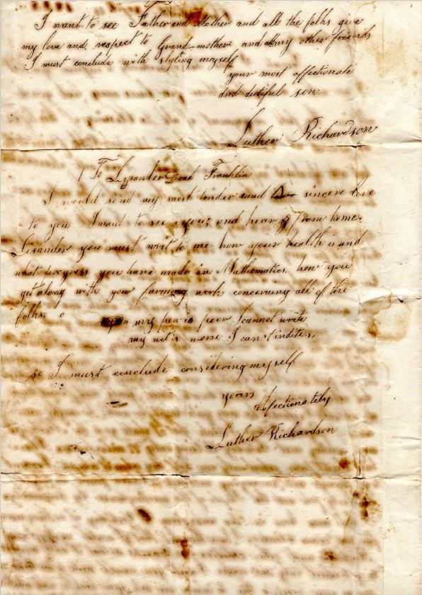 Luther came from a prominent Royalston family. Both his grandfather and father were selectmen. His father, Stephen Richardson (right) also served on the school committee. In the letter, Luther mentions visiting his Uncle Jacob, an academy graduate, who possibly lived in Hinsdale. As suspected, he found him “unfit for work” despite catching 84 pigeons in a day. Luther boarded with the Town Clerk, Abraham Wood, who lived on Winchester Road, about half a mile southeast of the Center Village. He was so pleased with the accommodations that he "would not change it for any place in town, everything is in order, we live well enough for a king”.