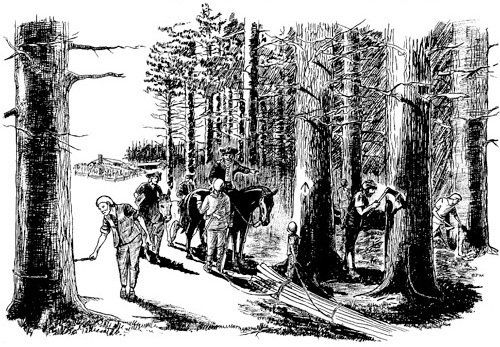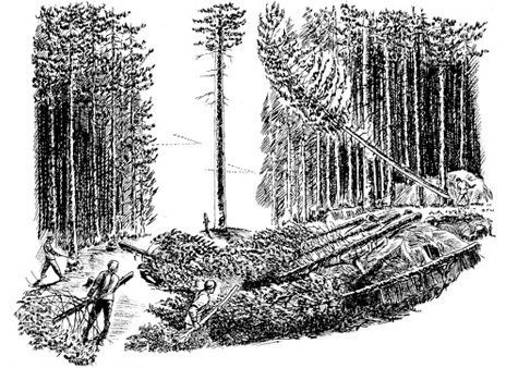 Felling and transporting a “Broad Arrow Pine” to the coast required precision and skill, plus numerous laborers. A mast pine had no value if it was split or landed in an area where it could not be retrieved. The whole process was overseen by a mast-master. Once a tree was selected, a landing area had to cleared and prepared. This process was called “bedding”. Uneven ground had to be smoothed, and rocks and stumps were covered by crisscrossing them with smaller fallen trees which would act like a cushion, absorbing the shock. Choppers, two men using axes on opposite sides of the trunk, were selected to do the dangerous job of felling it. (Saws weren’t used in the New England woods until the 1890s, over a century after the last mast pine was harvested.)