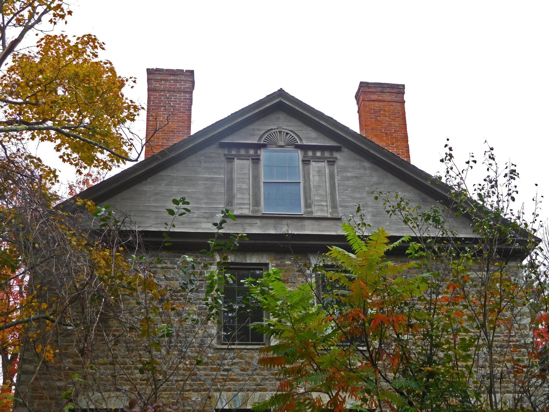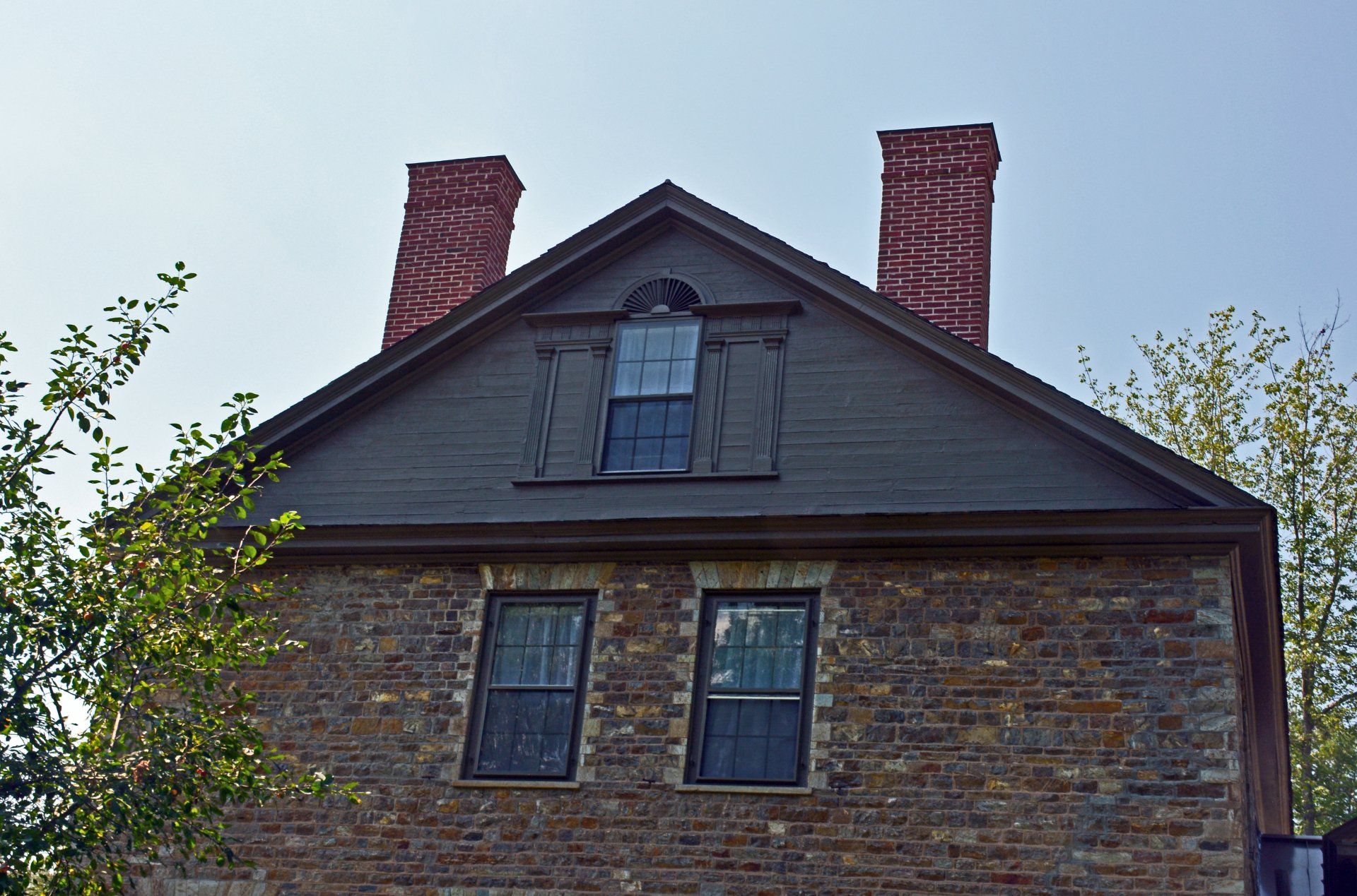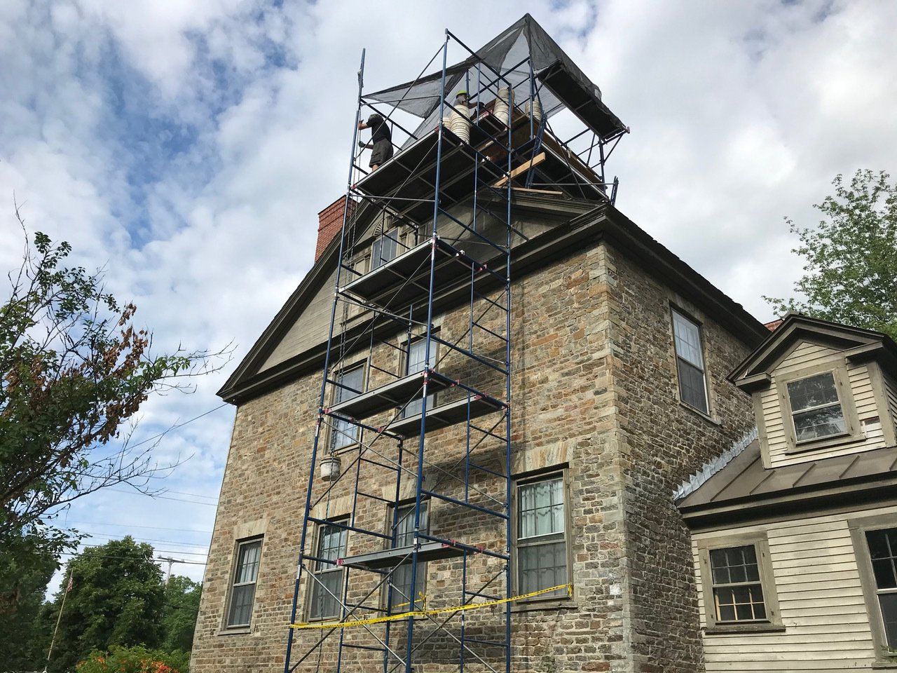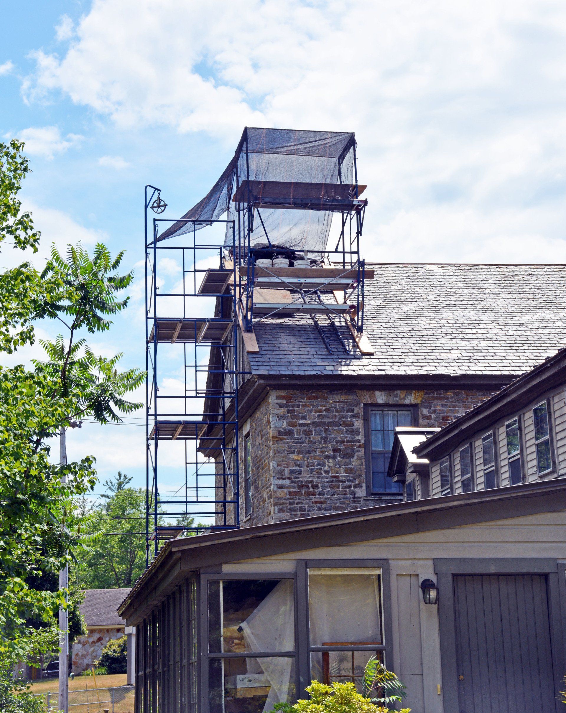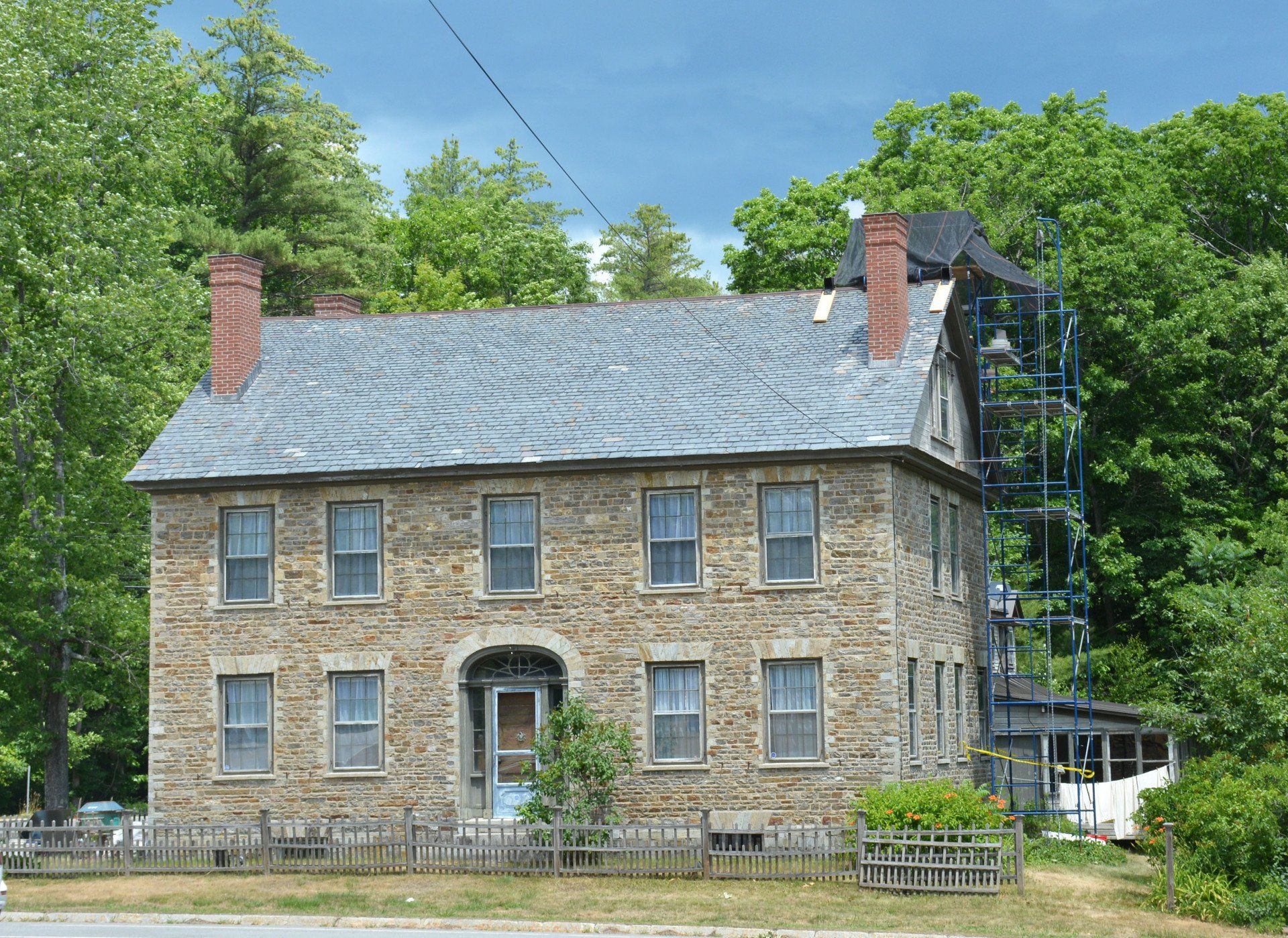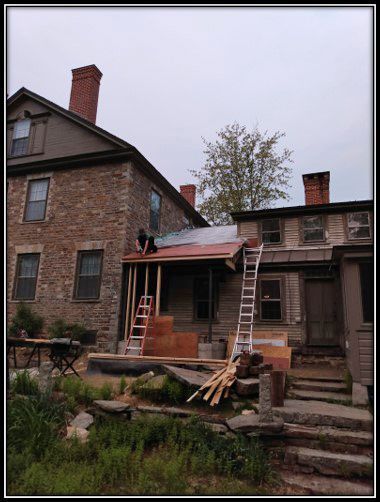 For 16 months construction continued until Phase 1 was completed. Chimneys were replaced with bricks/mortar appropriate for the time period, the slate roof was repaired (with new slates added as needed), the stonework was repointed, the exterior doors/windows were restored and repainted, new basement stairs were constructed, two basement windows were replaced, and, in the spring, the wooden gables and exterior trim were repaired and painted.