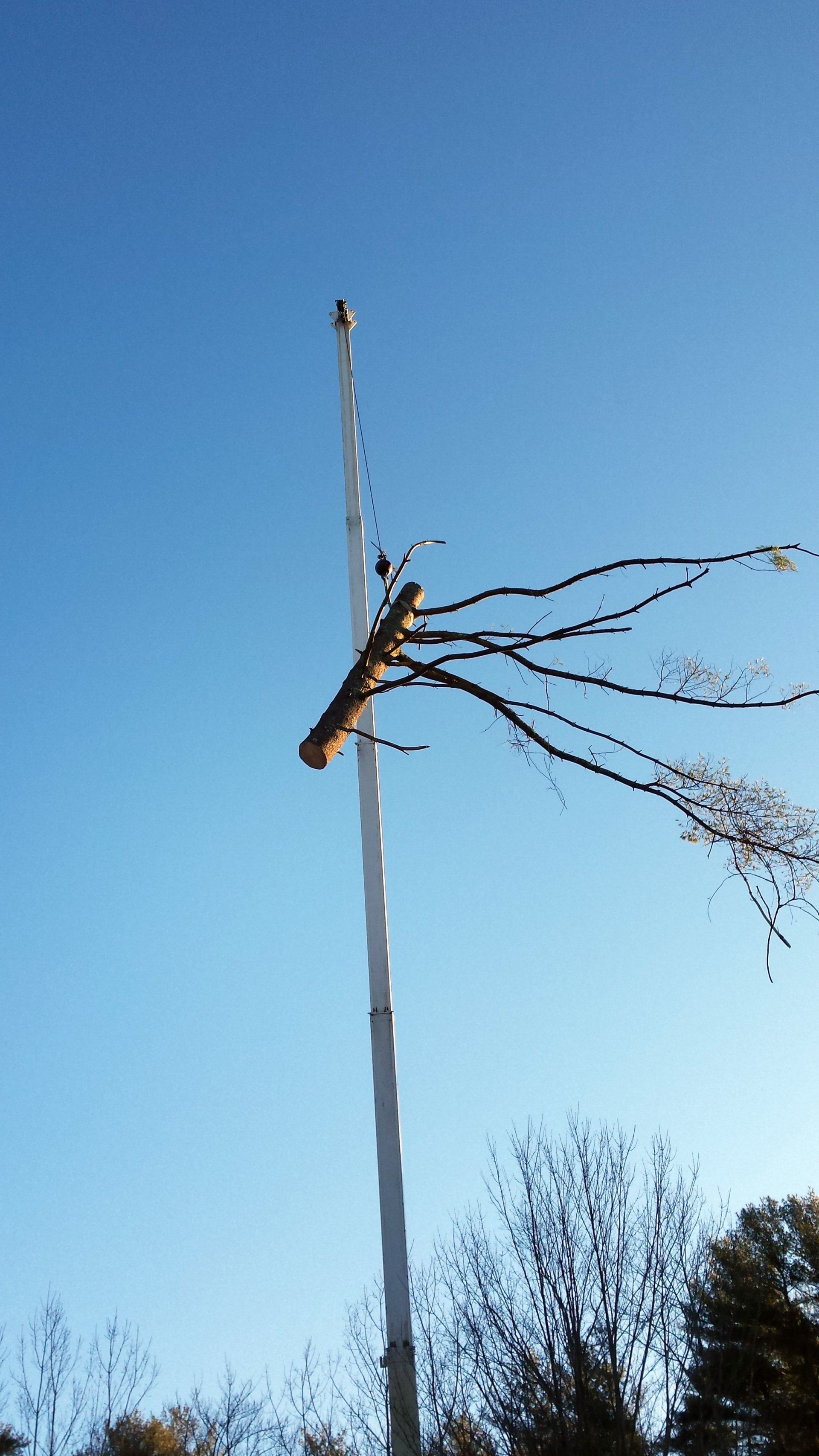 Wilcox Tree Service (below) solved some of the tree issues. Later in the year, the NH Highway Department redirected drainage from the parking lot and removed the two diseased maples along Route 63. The removal made a better site line for traffic.