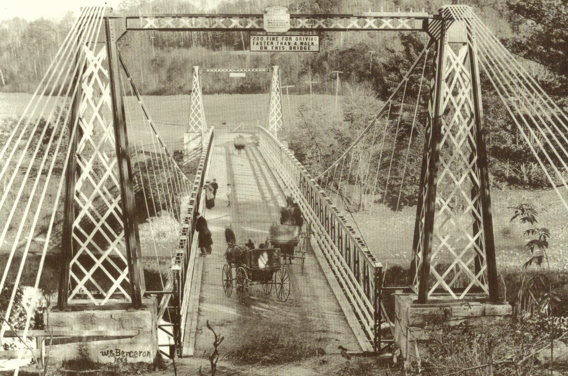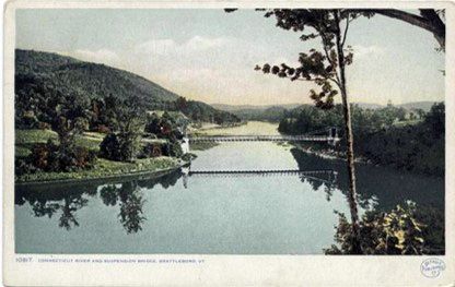 For many years, the only access to Brattleboro was via a ferry one mile upstream of the present Route 9 Bridge. In 1889, a suspension bridge was constructed in a nearby location. It consisted of one span 320’ long with a roadway 16’ wide. It stood for 46 years until Mother Nature came knocking.