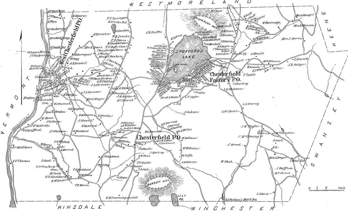 The D H Hurd Atlas New Hampshire is the source of this map and two of the village detail maps (See Chesterfield Factory & Lake Spofford sections). West Chesterfield Village is now designated a post office.