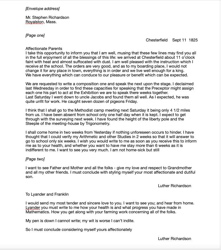 Historical Societies never know what will be found in the mailbox. In mid-January, CHS received a mystery envelope sent by an anonymous donor. Inside was an old yellowing letter written by Luther Richardson, a student at the Chesterfield Academy. His letter was dated September 11, 1825 and was to his parents in Royalston, MA.