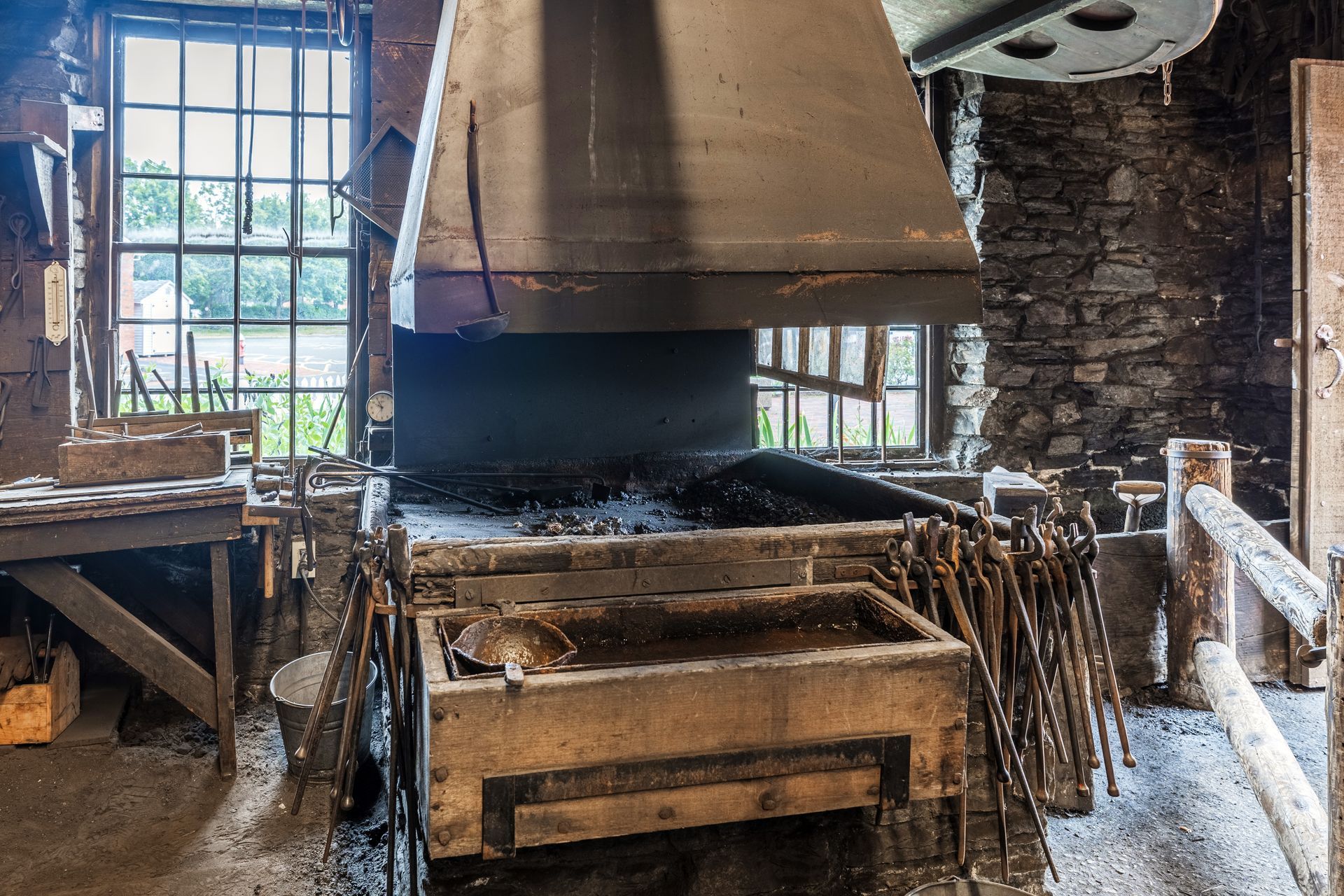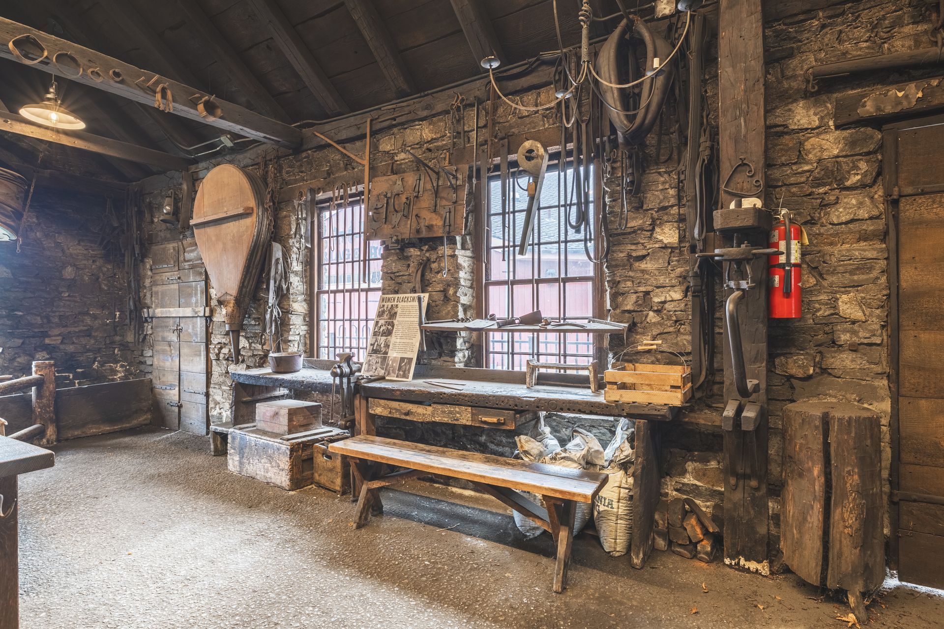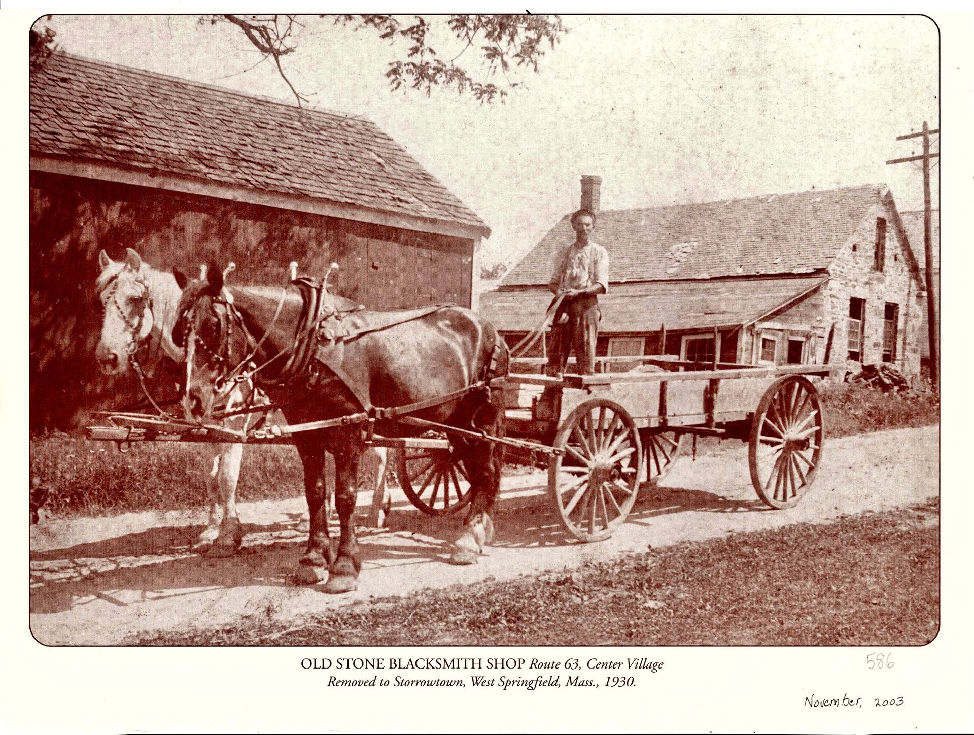Built around 1850 by Arza Clark, who came from a family of blacksmiths, the building was constructed of locally quarried, seam-faced granite. It remained a working shop until 1930 when the entire building was dismantled, piece by numbered piece, and moved to Storrowton Village Museum in West Springfield, MA. (The Big “E”) There, it continues as a smithery, educating the public in the fine art of blacksmithing. Some of the forge’s stones, as well as the nail bench, were also moved to Storrowton. The original bellows were initially used but have since been replaced. Hardware forged in Chesterfield, such as window “shutter dogs” and front door fasteners, are still seen today in the Town Hall and the Asbury Church.