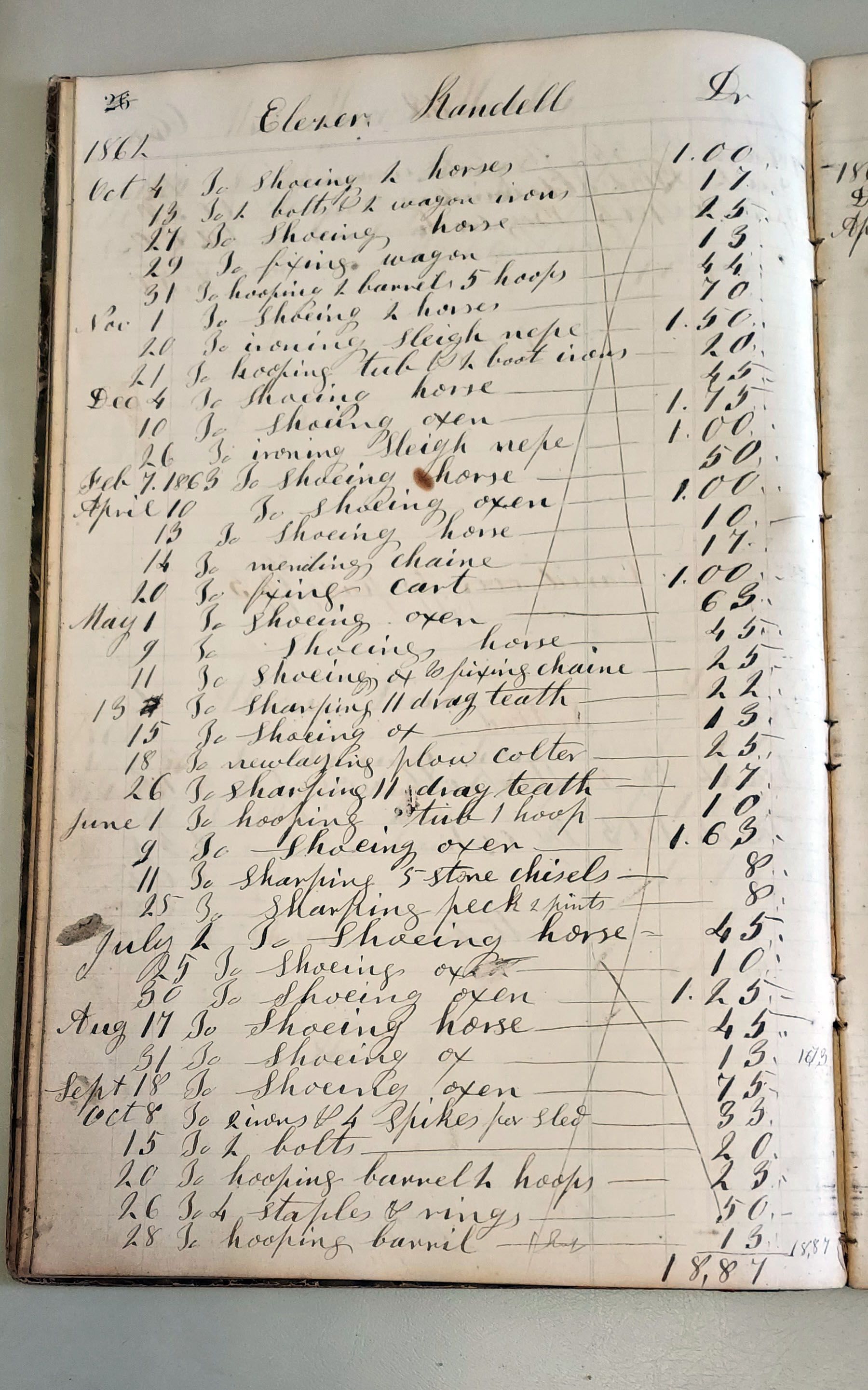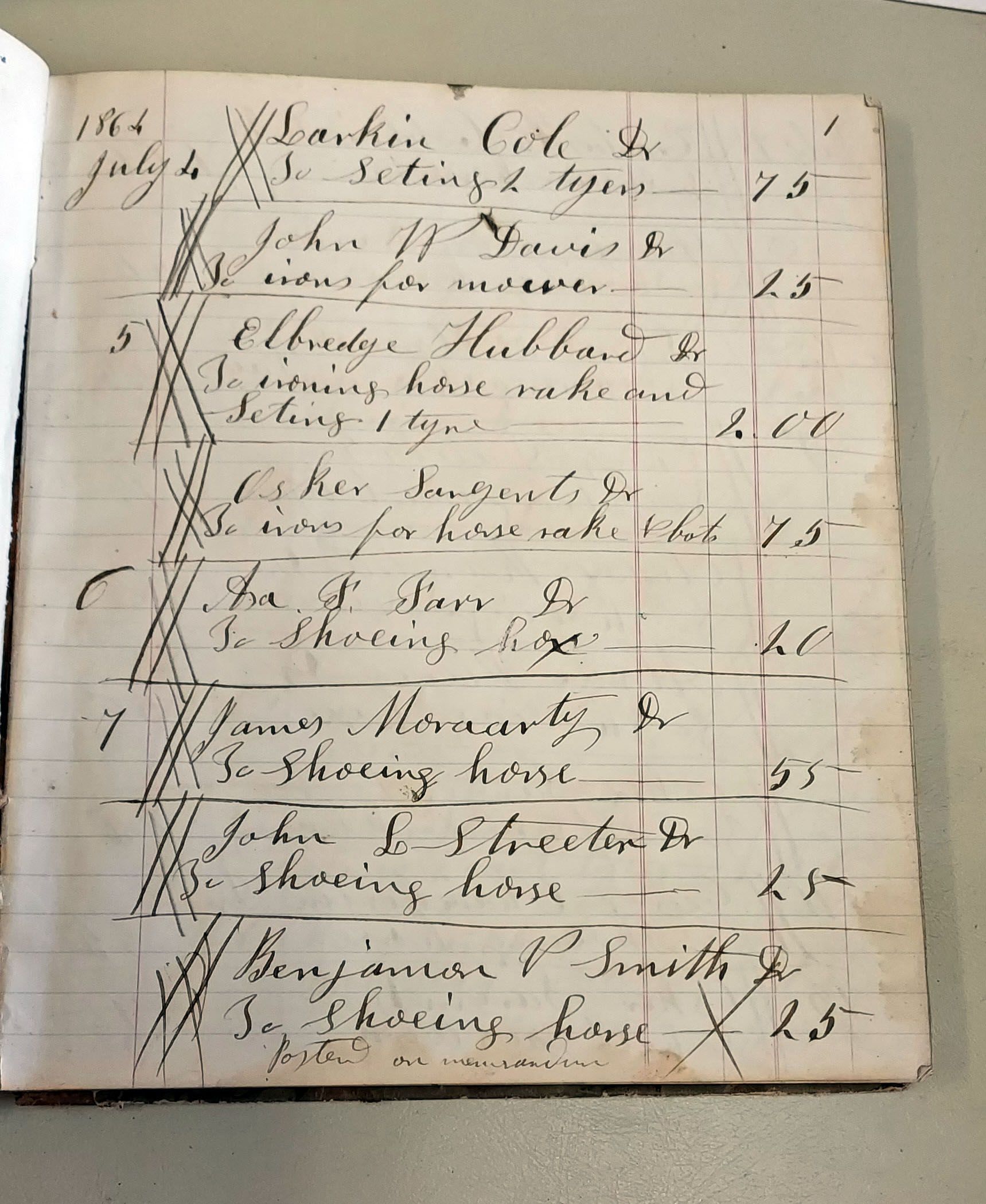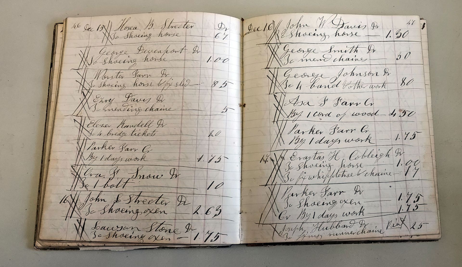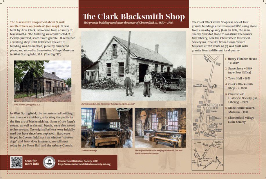 The Clark Blacksmith Shop was only one of several Blacksmith Shops in Chesterfield. Smith Starkey came to West Village (West Chesterfield) in 1855 and ran the blacksmith shop there. He was born in Richmond NH (section now part of Troy, NH) on March 19, 1807 to Timothy and Nancy (Smith) Starkey. The Chesterfield Historical Society archives contain two of his ledger books. They may be viewed upon request.
