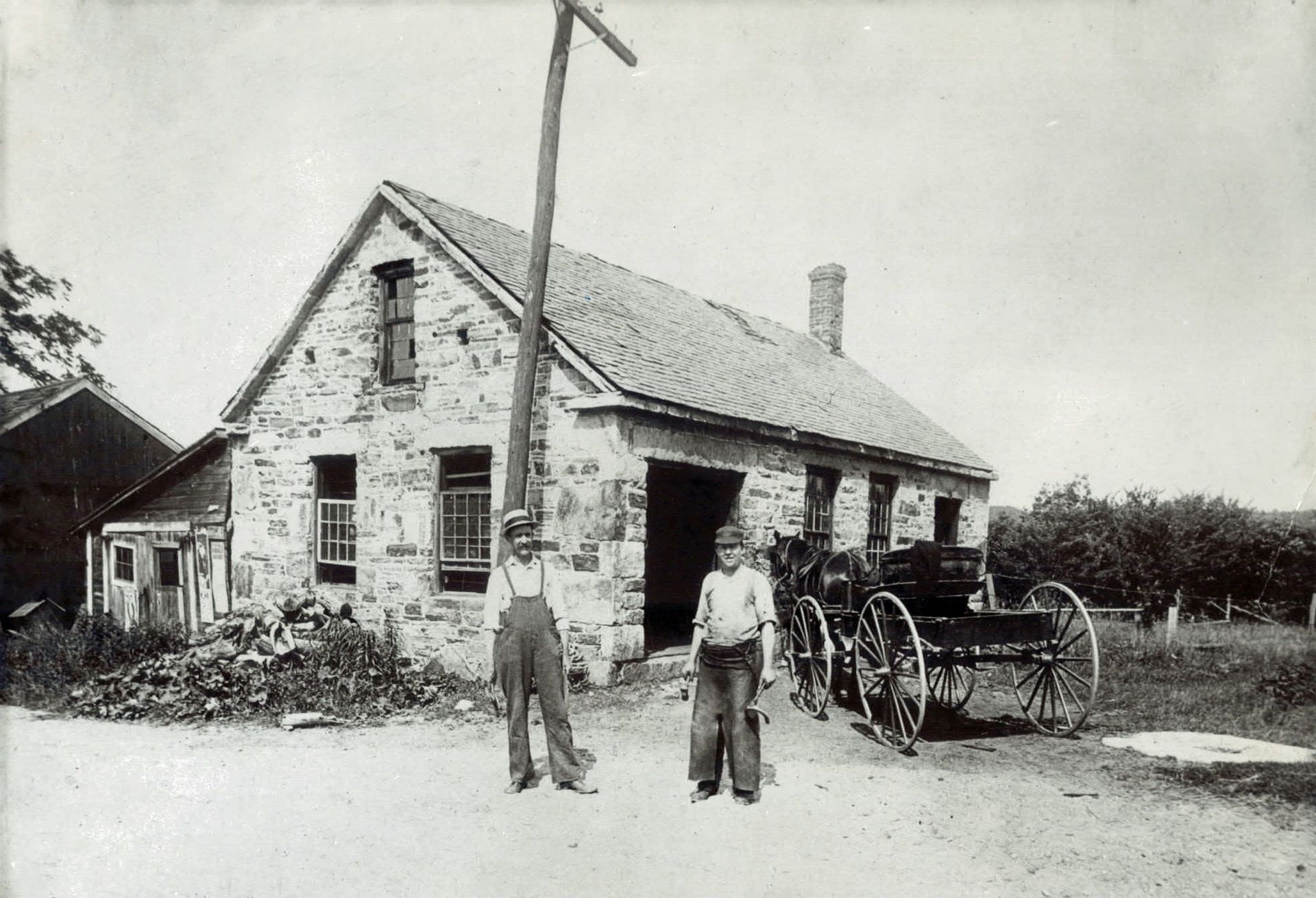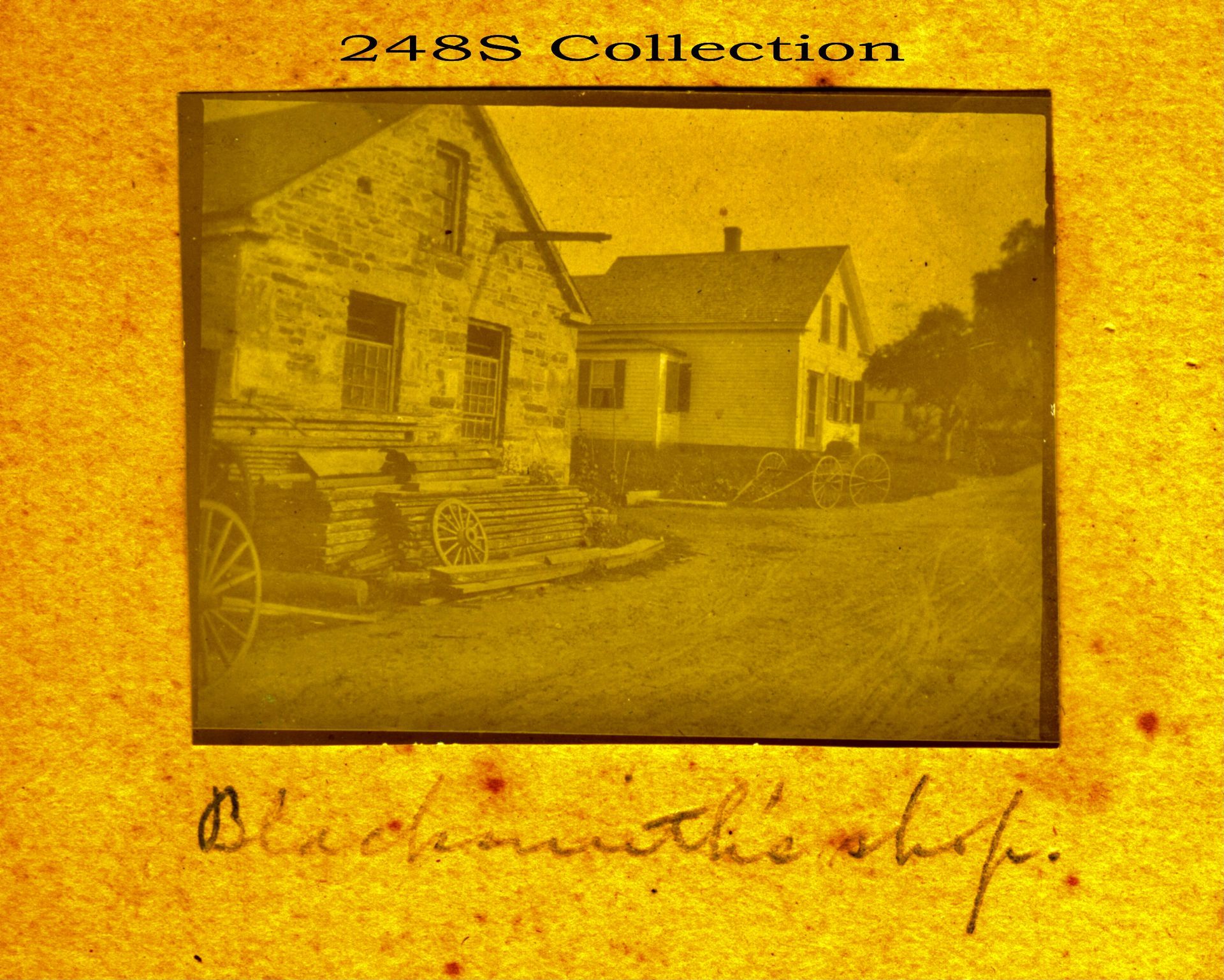"The lean-to was the carpenter shop of Robert C. Goodrich (my Dad). The building in the rear of it was a storage shed for Chester Puffer's farm tools in winter. Lee Higgins (left) is the blacksmith with Robert Goodrich (right). He was the last known blacksmith to operate the shop. The dog was Lee Higgins." (Photo gift from Ruth Berry, daughter of Robert C. Goodrich)