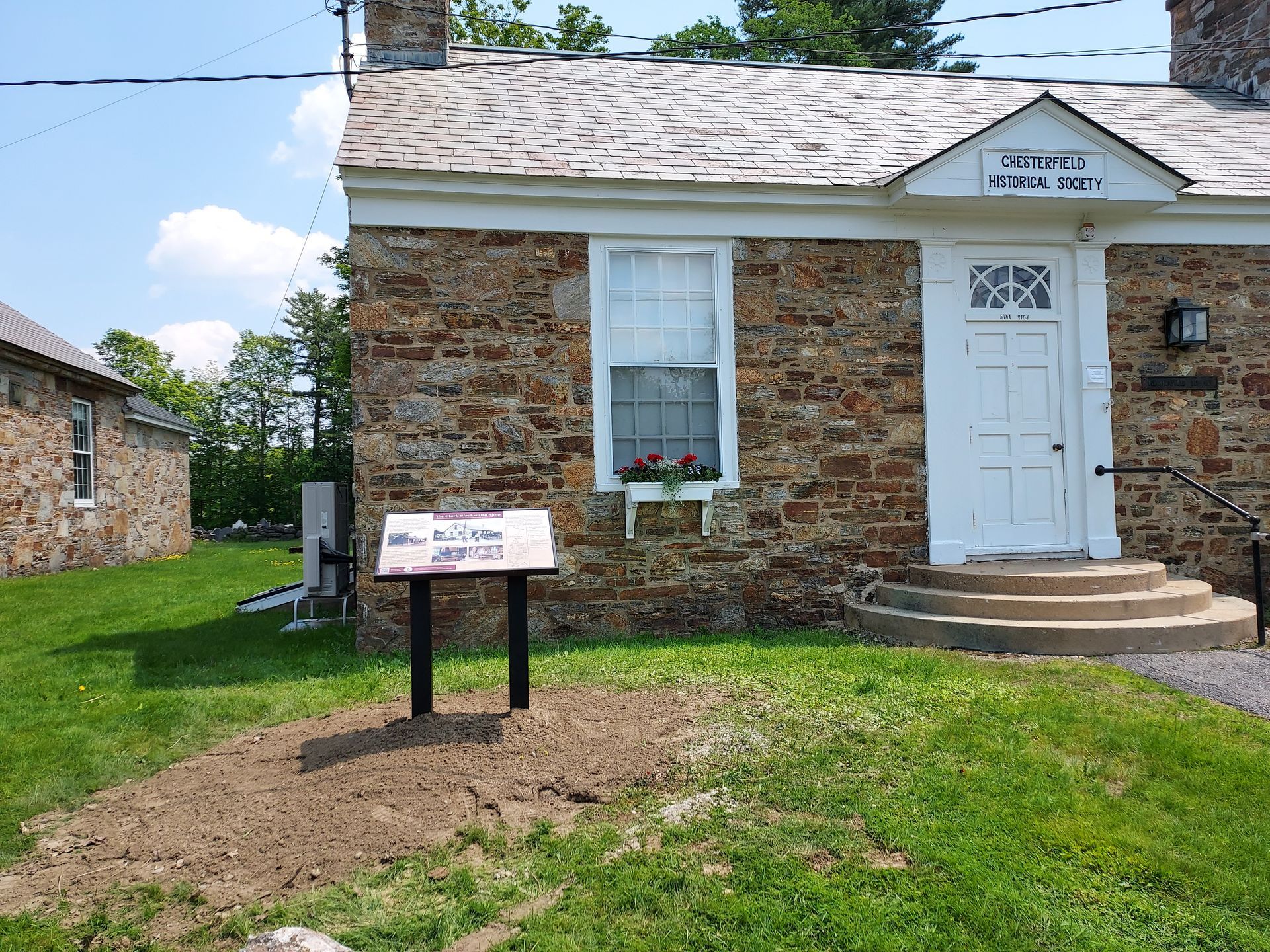 “In the fall of 1929 Laura Green, Mrs. J.J. Atema, and I came to Chesterfield to be the teachers in the local school. On weekends we wandered about town, going thru cemeteries, the local jail*, and the blacksmith shop in a field between Mary Webb’s and Henry Chickerings if my memory is correct. That winter (1930) a team of men came to take it down. They boarded at “The Pillars” where we did. It was interesting to hear how carefully it was being removed, piece by piece and every piece being numbered and recorded.”