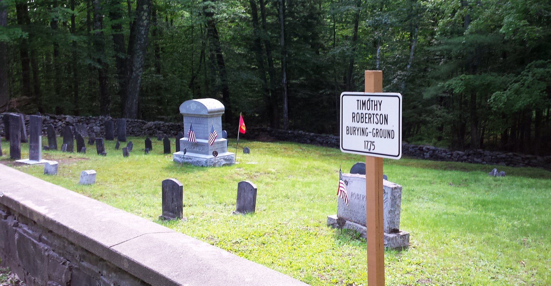 Also known as the North-west Burying-ground, it was bought by James Robertson in 1813 and was located on the corner of the Robertson farm. There are 25 stones bearing 44 names ranging from 1775 – 1995. Adjacent to the cemetery is the sign commemorating the first preaching of Methodism in New Hampshire, which took place near the Robertson farm. The burying-ground is located on the west (left) side of Poocham Road about 1 ¾ mile north of Route 9