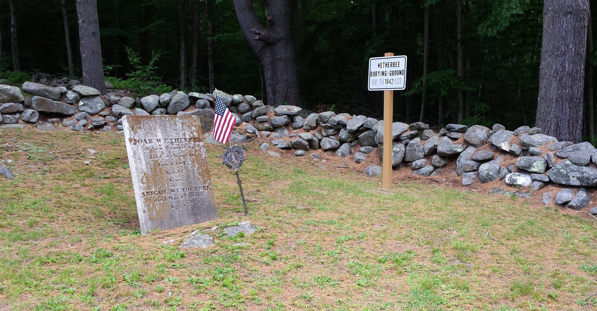 This unique graveyard is the town’s only circular one and the smallest. Only one stone marks the graves of Joab, d. 1842 - a Revolutionary soldier and his wife Abigail Wetherbee, d. 1846. They lived on top of the hill where the Friedsam Cemetery now is. It is located on Route 63, ½ mile south of the intersection of Route 9 next to the entrance of the Friedsam Cemetery.