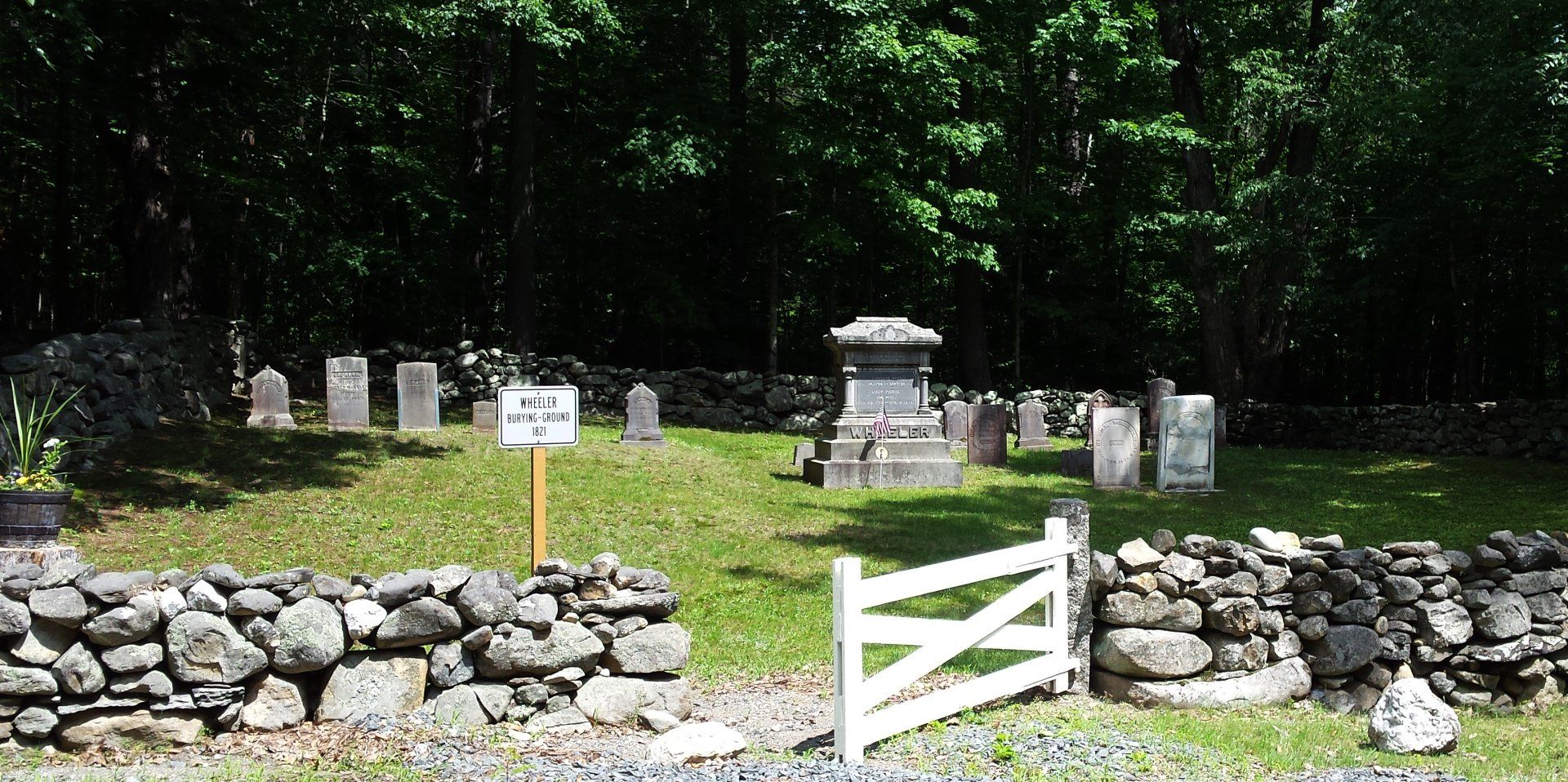 The yard contains 19 known graves, ranging from 1821 – 1921. The descendants of Peter Wheeler, a housewright and one of the town’s first settlers are buried here. Among them are Watson Wheeler, buried beside his three wives and two of his children. It is located a short distance south of Route 9 on the east (left) side of Twin Brook Road.