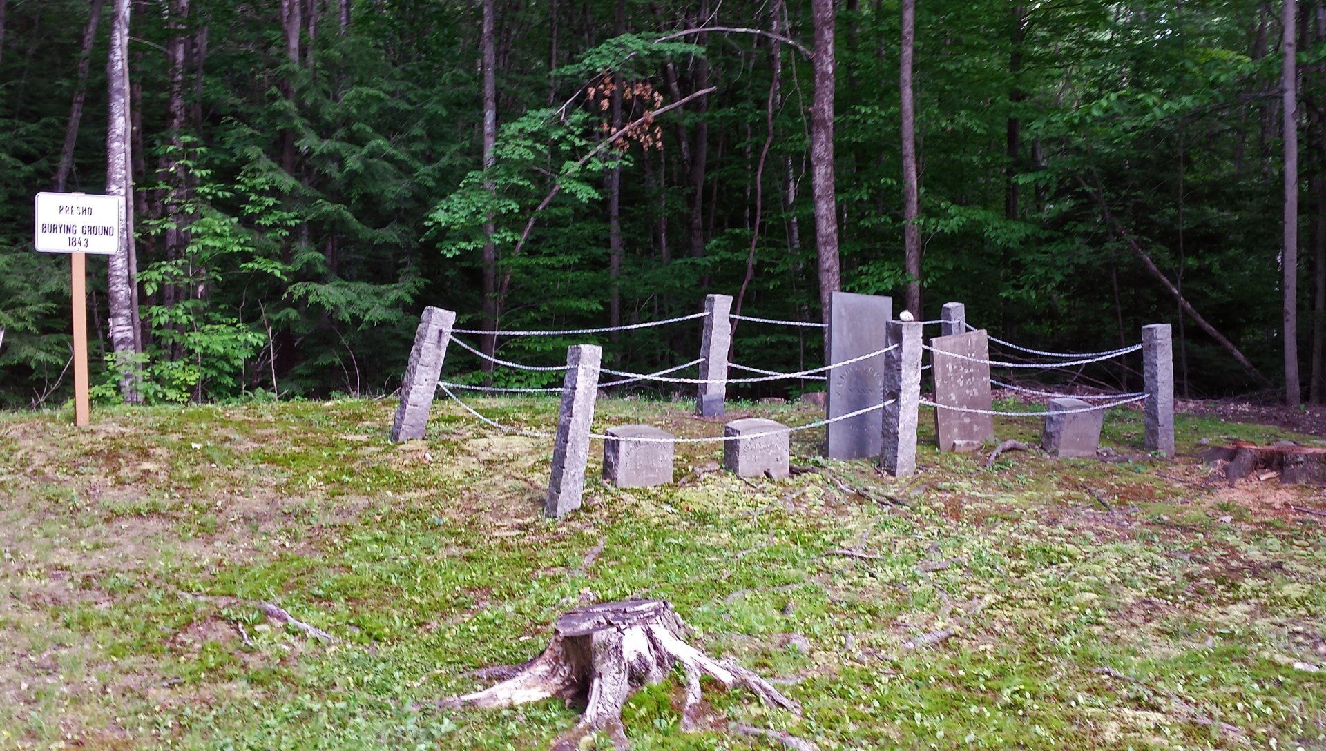 There are ten marble stones here with dates ranging from 1830 to 1904. Notable stone is for Sarah Draper who lived to the age of 101 years. This is a fine old burying-ground in a pretty but difficult to get to setting. Go past Pisgah Park’s main gate at Beal’s Road. This road continues across Hine’s meadow which during high water is not accessible via vehicle. It is recommended that you walk. Stay on the road about a mile, passing a log landing on the right. The cemetery will be on the left.