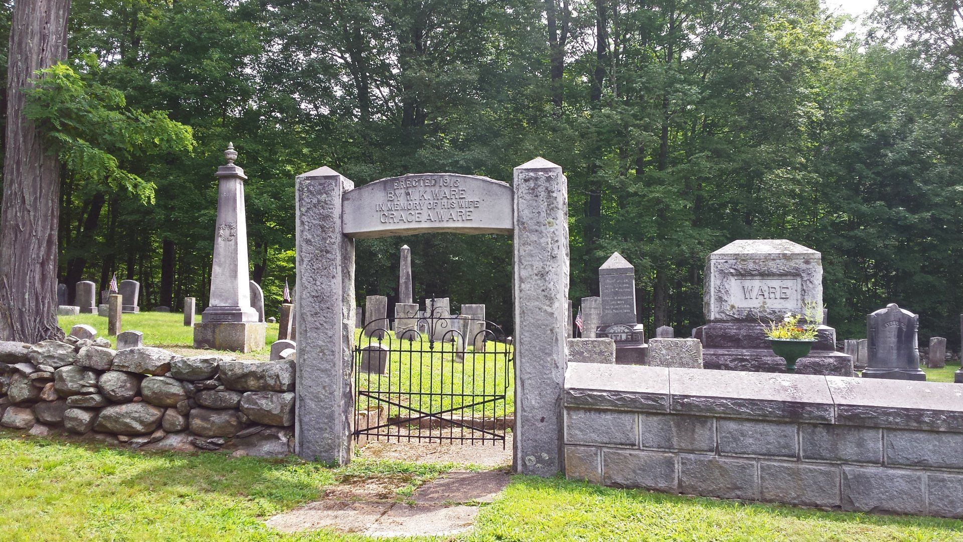 Built on land given to Benjamin Joslyn in 1815 and later added to as a private association, this cemetery contains about 150 stones listing 247 names whose death dates range from 1815 – 1936. The southwest end (Joslyn) is the oldest and contains the grave of Rev. Abraham Wood, Chesterfield’s first minister and that of Bvt. Brig-Gen. Herbert B. Titus (See Notable Chesterfield Persons). The later northeast section is adorned by the 1890 Ware Gateway and contains the family plots of many prominent 19th Century Chesterfield citizens including Ezekiel Pierce Family who owned and operated what is now, The Stone House Tavern. To find it from Chesterfield Center take Old Chesterfield Road east for about ½ mile. The cemetery is located on the right (southeast) side of the road.