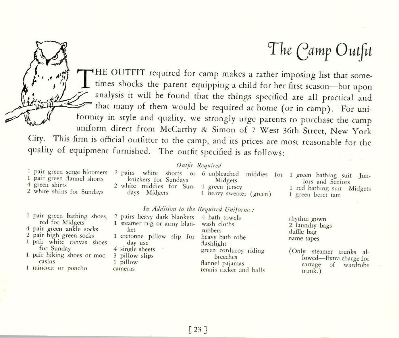 The camp outfit was very specific making a “rather imposing list that sometimes shocks the parent equipping a child for her first season”. However, they were toted as all practical with most required at home or at away camp. It was recommended that the uniforms be purchased directly from McCarthy & Simon of NYC. In addition to the daily and Sunday’s white uniform, the list included such things as bedding, bath towels, different colors bathing suits by age, tennis racket and balls, along with a rhythm gown. These should be packed only in a steamer truck as there was an extra fee for cartage of a wardrobe truck. The steamer truck transfer fee was $1. Laundry service was provided which averaged $1.25 per week.