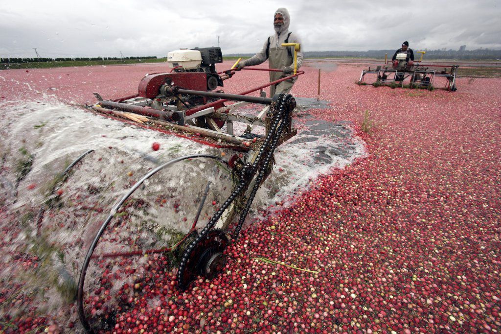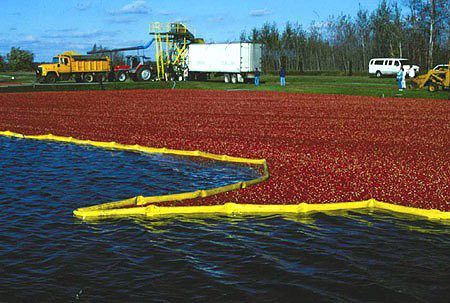Climate is critical to the plant. Cranberries love a moderately warm spring without a late frost, and a hot summer with only about an inch of rain a week. This allows the fruit to be pollinated and set. Once the berries have ripened into a rich red, commercial bogs are flooded. Mechanical beaters enter the water knocking the upright berries off the plants. The berries are floated into pens, vacuumed up, dumped through a grate where twigs and sticks are removed, and then poured into trucks to be driven to a factory where they are immediately frozen. Because wet harvest is hard on the berries, these berries are normally used in one of the many manufacturing process, such as, juice, sauce, etc. However, dry harvested berries are most often sold fresh.