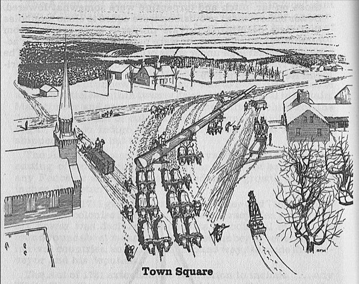 Felling and transporting a “Broad Arrow Pine” to the coast required precision and skill, plus numerous laborers. A mast pine had no value if it was split or landed in an area where it could not be retrieved. The whole process was overseen by a mast-master. Once a tree was selected, a landing area had to cleared and prepared. This process was called “bedding”. Uneven ground had to be smoothed, and rocks and stumps were covered by crisscrossing them with smaller fallen trees which would act like a cushion, absorbing the shock. Choppers, two men using axes on opposite sides of the trunk, were selected to do the dangerous job of felling it. (Saws weren’t used in the New England woods until the 1890s, over a century after the last mast pine was harvested.)
