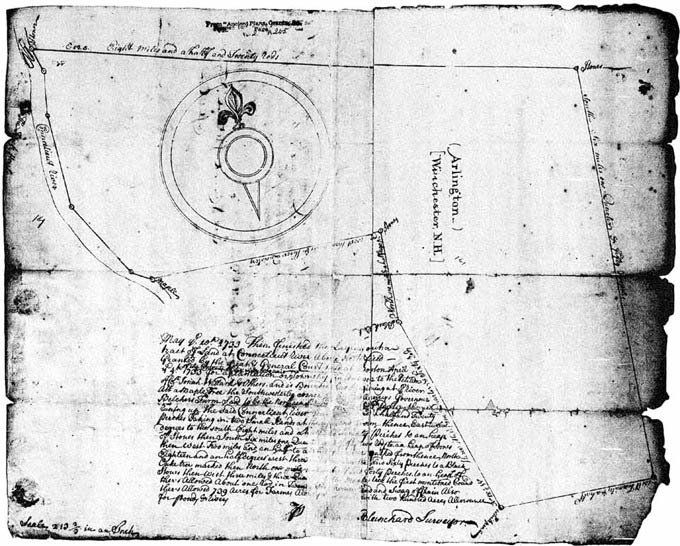 Old Winchester (then called Arlington) had an inverted “L” shape which gave it both frontage on the Connecticut River and prime land in the Ashuelot River valley. It stretched all the way to the Connecticut and included the northern part of Hinsdale across from Brattleboro. The north line of 1733 Arlington is the same as today’s Chesterfield south line.