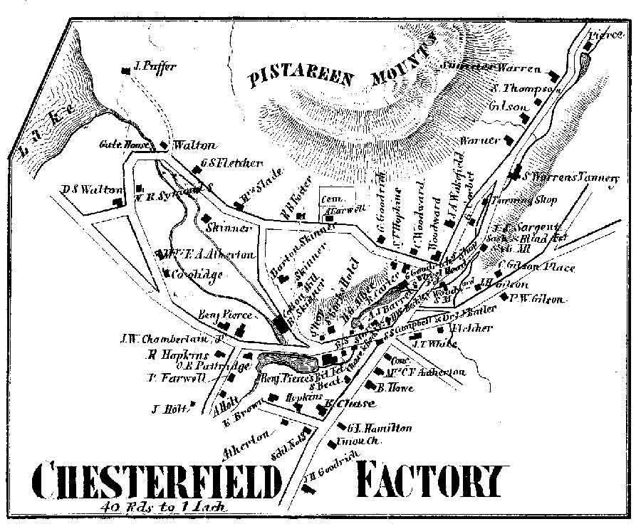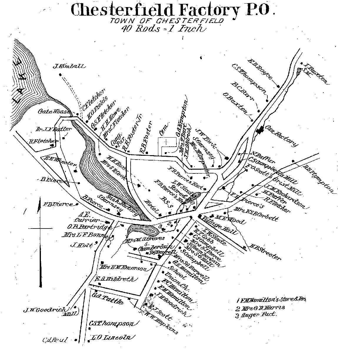 The 1858 map of Chesterfield Factory (Spofford) shows a hotel, two stores, a church, and many mills and shops. The gate house at the outlet of the lake, indicates a dam was already constructed. Several mill ponds are also shown. (This map comes from the large county wall map.)