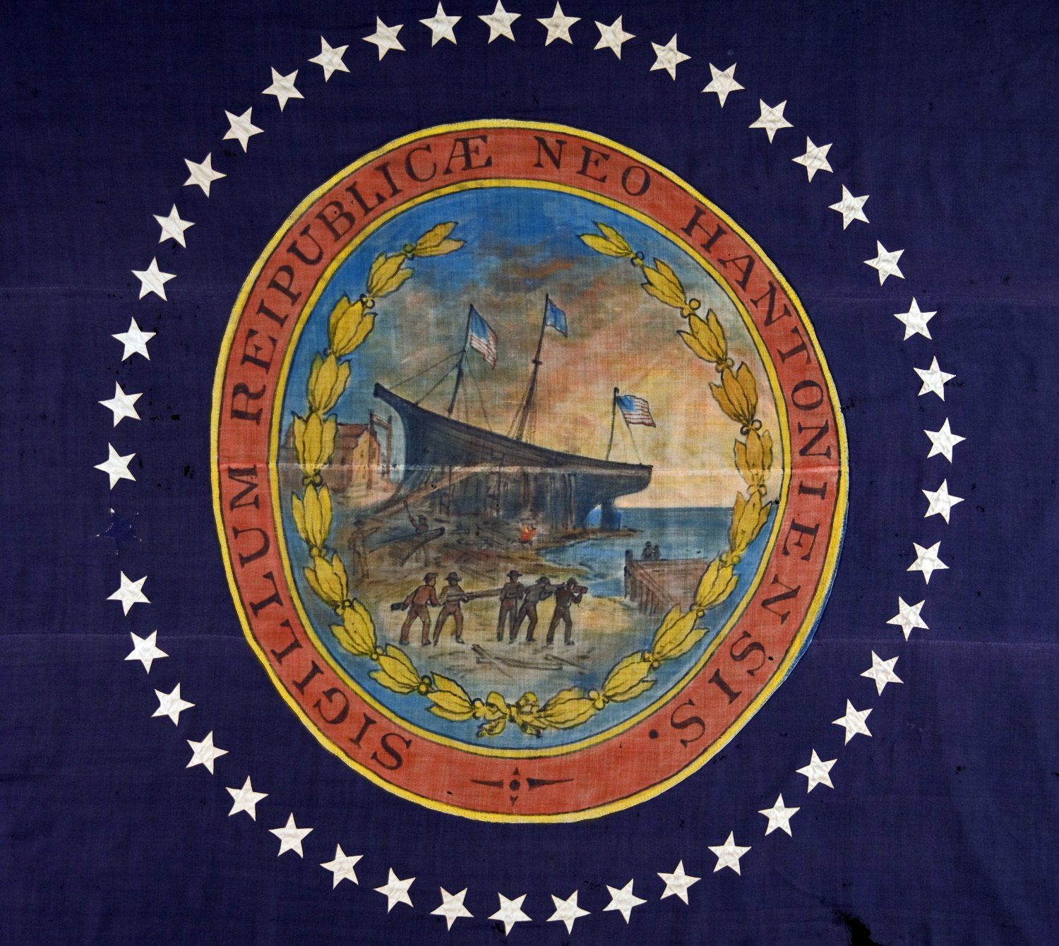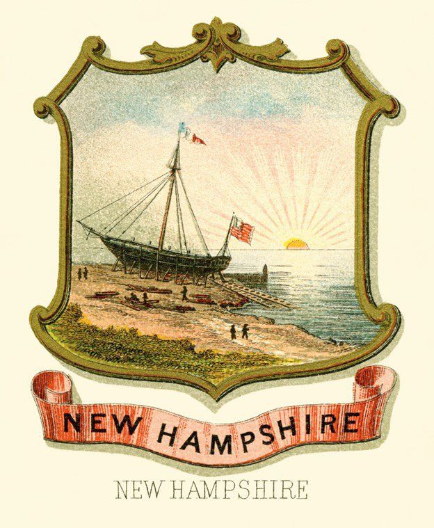 When the 1776 State Constitution was replaced in 1784, the legislature also revised the seal. New Hampshire had become a leading ship manufacturer. Therefore, a ship in stocks with an optimistically rising sun behind it reflected the State’s importance to the new nation. Items to be shipped would be in the foreground. Encircling it would be the Latin phase, "Neo Hantoniensis 1784 Sigillum Republica" (The Seal of the Republic of New Hampton 1784).