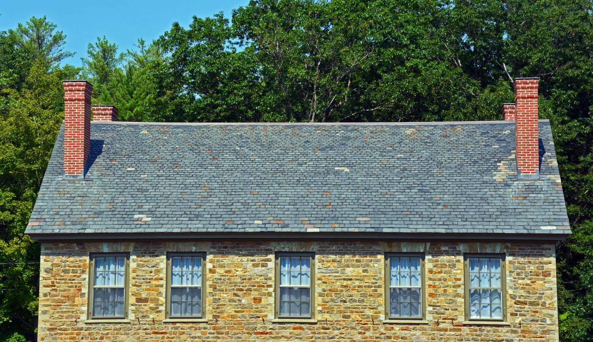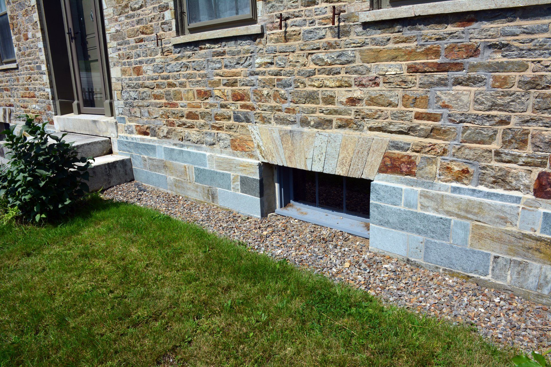 For 16 months construction continued until Phase 1 was completed. Chimneys were replaced with bricks/mortar appropriate for the time period, the slate roof was repaired (with new slates added as needed), the stonework was repointed, the exterior doors/windows were restored and repainted, new basement stairs were constructed, two basement windows were replaced, and, in the spring, the wooden gables and exterior trim were repaired and painted.