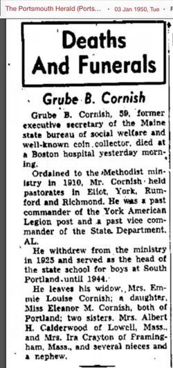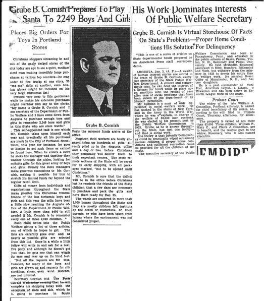 From Chesterfield, Cornish went on to be parson in Eliot, Rumford, Richmond, and eventually York, ME, where a second daughter, Eleanor, was born in 1920. When WWI broke out, he became Chaplin to the 5th Army Division, serving overseas 1918 – 1919. Afterward he joined the Maine National Guard, retiring as a Lt. General in 1935. He left the ministry in 1925 to become Executive Secretary of the Maine Office of Charities and Corrections. His devotion to the "Methodist Social Creed" earned him national recognition. He ended his career as Superintendent of the Maine State School for Boys (a reform school). Rev. Cornish died on Jan. 2, 1950, and is buried in Portland, ME. He left behind a legacy of good work which inspired many, especially his daughter, who followed in his dedication to social work.