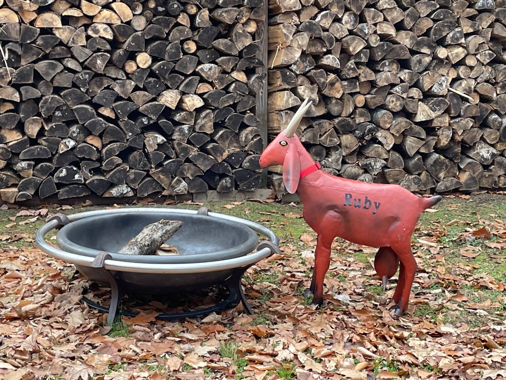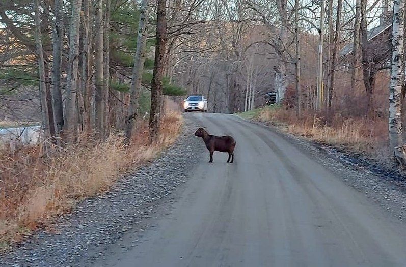 For almost a month, Ruby the Goat became one of the most important story threads on the Chesterfield Group page. With her missing left eye, Texas ear tag, and her inability to bleat, locals fell in love with her saga. Ruby’s story began in the summer of 2021 when she was noticed wandering about Route 9 and became dubbed “The Route 9 Traveler”. How she got there and when she arrived is unknown. In August, Elizabeth Walker, Margo Bergeron, and Carl Chickering finally corralled her and moved her to a new home with Craig Faulkner on Reynolds Road in Westmoreland (just north of the West Chesterfield town line). There she resided with her new buddy Niblet and some sheep. That was, until Nov 23, 2021. Faulkner’s sheep bumped open the inside barn door, enabling Ruby and Niblet to make their grand escape.