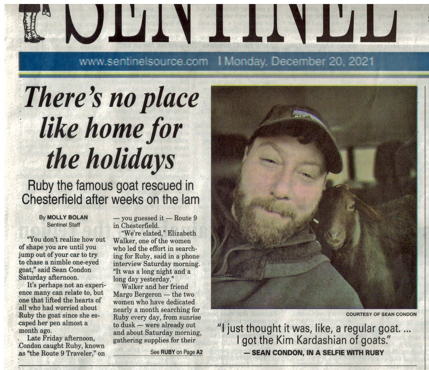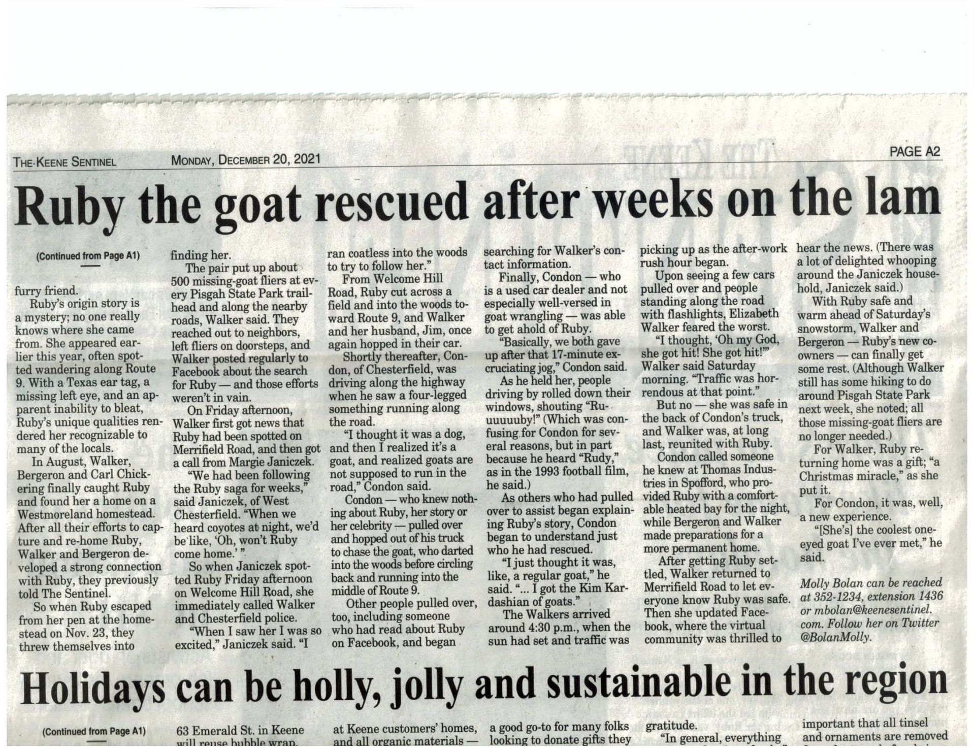 Walker’s last Facebook posting in the adventure was a fitting tribute to all the folks who had supported the 24-day long search for a one-eyed goat. In true form, the responses were jubilant. T-shirts were made proclaiming “Ruby the Town’s Mascot”. Some folks proposed the Town Report be dedicated to her. Who could argue with Ruby’s celebrity status when the December 21, 2021 Keene Sentinel’s front-page headline story was about Ruby and included Condon’s selfie with his captive prize?
