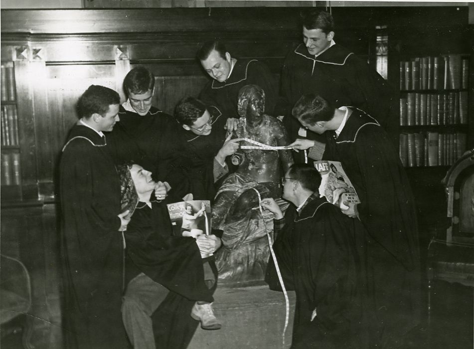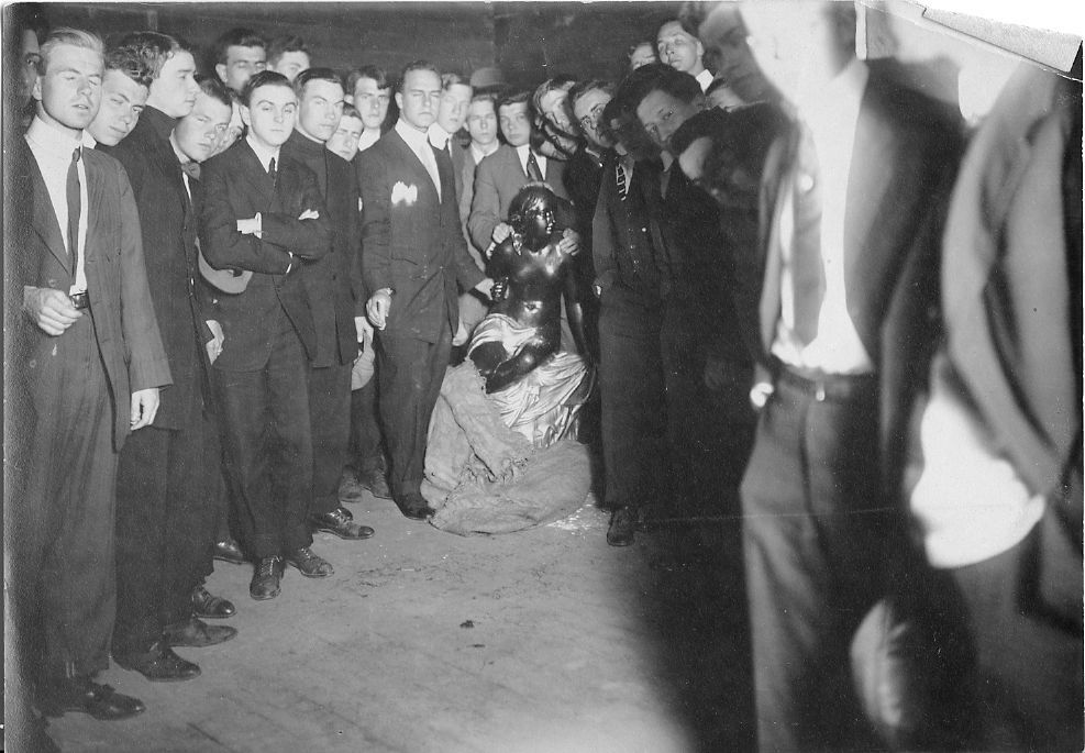 It only took four years for the students to find her, and then began a long-term inter-class rivalry. The rivalry centered on stealing the statue back and forth between odd and even year classes. She would disappear only to grandly appear at the class banquet of whichever class had possession of her. During the event, custom dictated that she be toasted, have her picture taken, and have all the students bestow a kiss upon her (which “she never objected to”). Therefore, the banquets became prime opportunities for the other classes to cleverly appropriate the little lady (sometimes rather violently).
