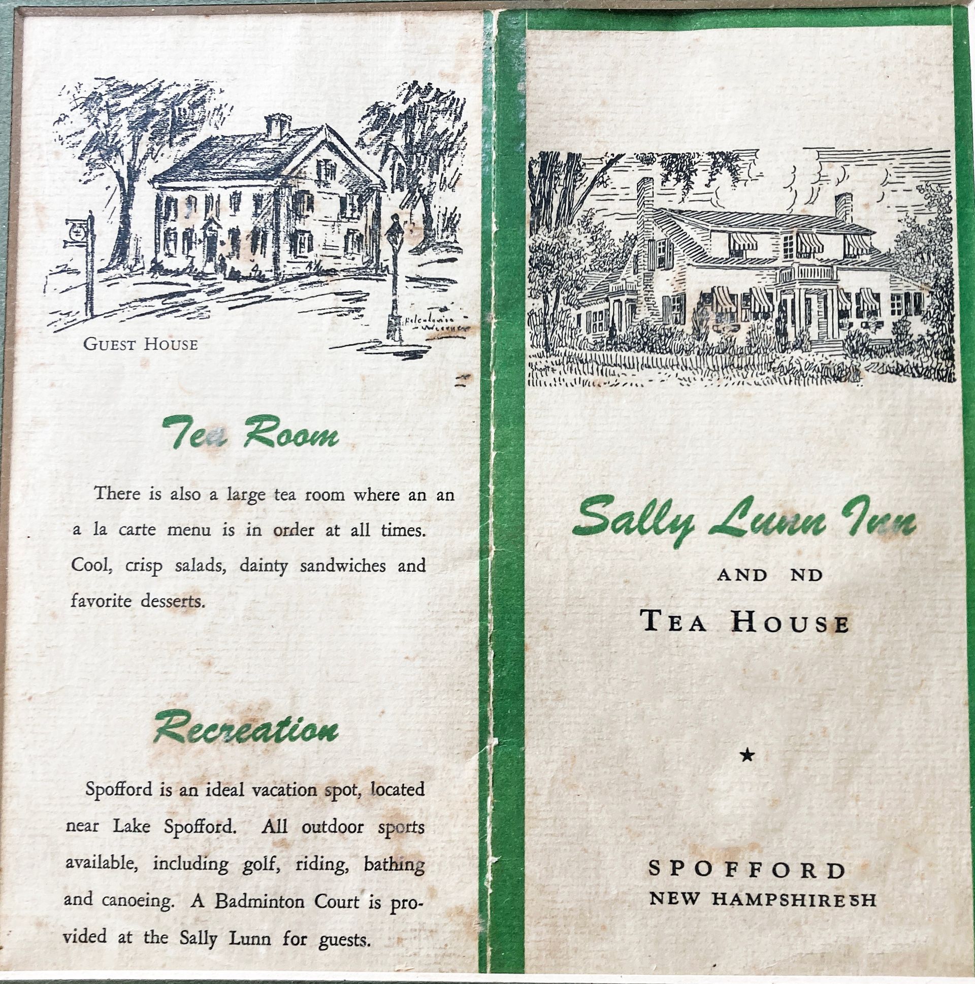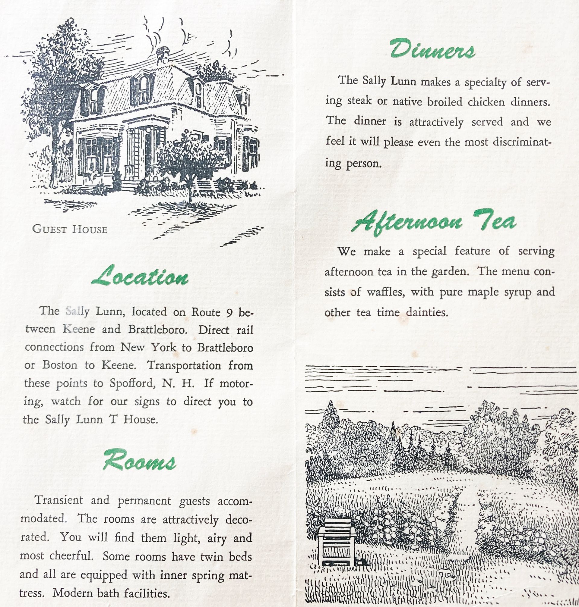 Sally was quite the entrepreneur. The T House expanded into the Sally Lunn Inn & T House, boarding teachers from the Spofford Grammar School. Along with her husband, Ralph Stevens, and her sister, Ruth Wood, she purchased two other buildings. They converted another Spofford house into an occasional family residence. The ell of that building contained a woodshed, attic, outhouse, and horse barn. Eventually, they expanded it into the Sally Lunn Annex which accommodated overflow guests from the Lake Spofford Hotel and provided housing for the Sally Lunn businesses' summer help. The second building was a “fixer upper” on Main Street which they converted into the Sally Lunn Coffee Shop.