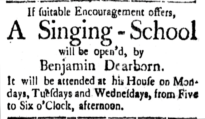 Boston's William Billings (1746-1800) wrote the most popular tunebook in 1770 “The New England Psalm Singer”. He is considered one of the earliest American composers. He wrote in four-part chorus, sung in a cappella style. Eventually, he published five tunebooks that included original patriotic songs, plus a manual for singing masters. The manual advised how to run a practical singing school, including topics such as logistics, expectations for manners and attentiveness in students, and “the need for the supremacy of the teacher's musical decisions”.