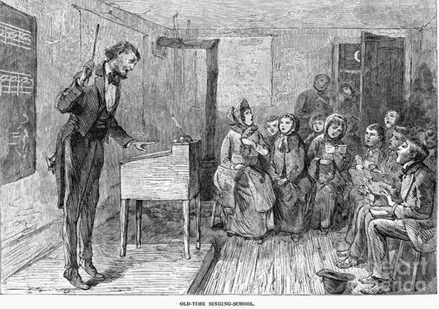 Now a good education requires a well rounded curriculum. But in the early part of Chesterfield’s history, its purpose was to learn to write with “a good hand”, set down thoughts “while warm”, and accurately account. Children's exposure to music was reserved for church and maybe folk tunes at home. The First Great Awakening (1730 - 40s) started revolutionizing church music and the Revolutionary period saw the need to replace English sacred music with a more American sound. Thus, rose the popularity of Singing Schools, a New England phenomenon which would spread throughout the south and west.
