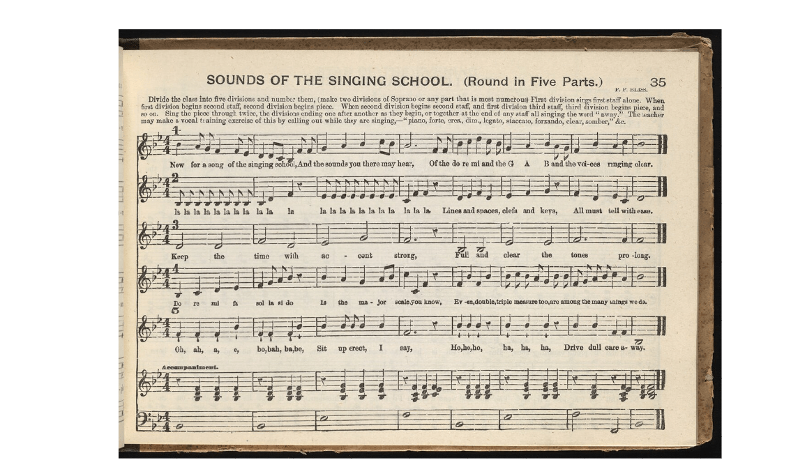 In a Singing School, rudimentary musical sight reading, and the mechanics of singing were taught by a “'singing master”. These masters were frequently itinerant ministers or singing schools "graduates" who decided to use their skill for additional income. Their teachings were aided by the invention of the shape-note method. This used four distinctive note heads to indicate four syllables corresponding to the musical scale tones mi, fa, sol, and la. Instructors would create printed manuals called tunebooks which contained instructions, scales, etudes, and sacred choral music. By the end of the era about 1,400 tunebooks were printed.