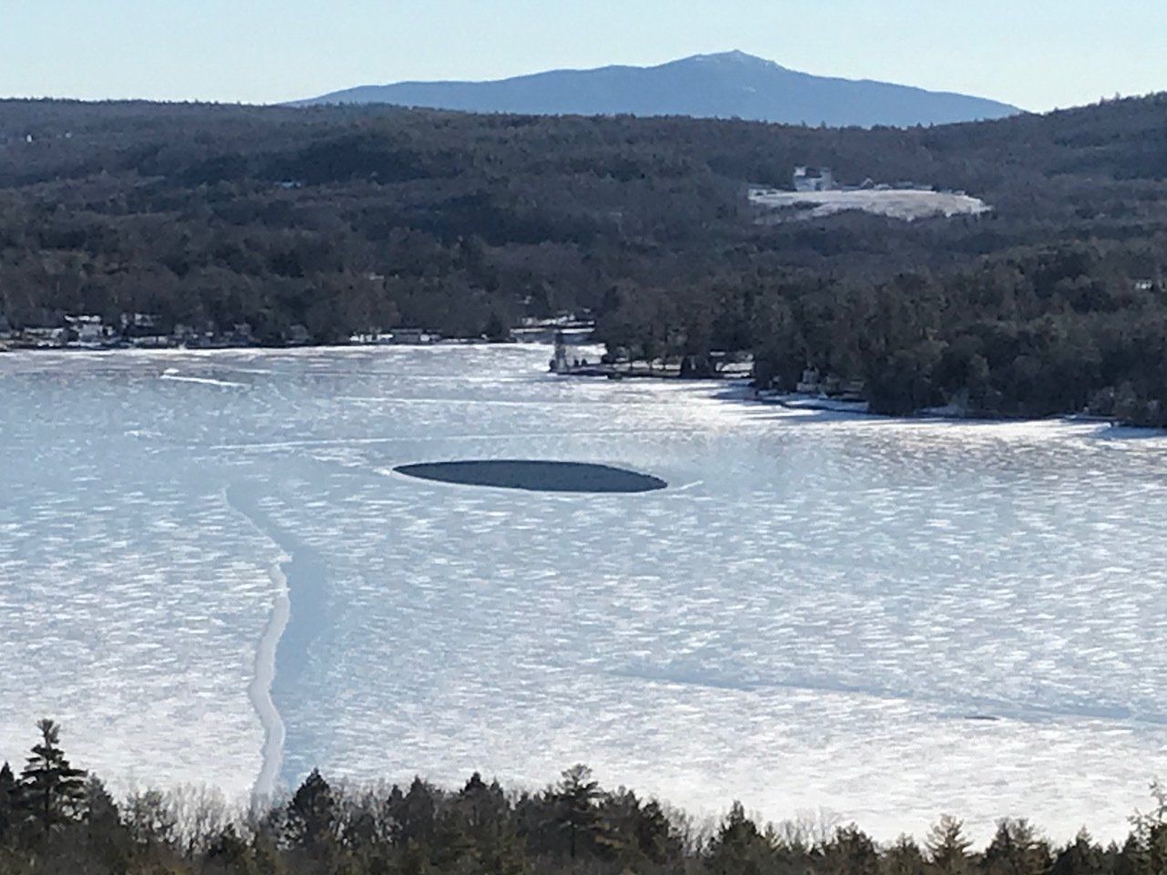 During the winters of 2019/20 & 2020/21, a mysterious hole has appeared in the same location on Lake Spofford’s ice. This phenomenon is new in the lake’s history. Its cause has become quite a riddle, and its appearance this year created a problem for establishing the “Ice In” date for the Spofford Lake Association (SLA) first annual Ice Out Lottery. After consulting with the State Environmental Service Department, the Ice In date was finally declared as January 12th, because ice covered the entire lake on that day, except for the infamous open ice hole.
