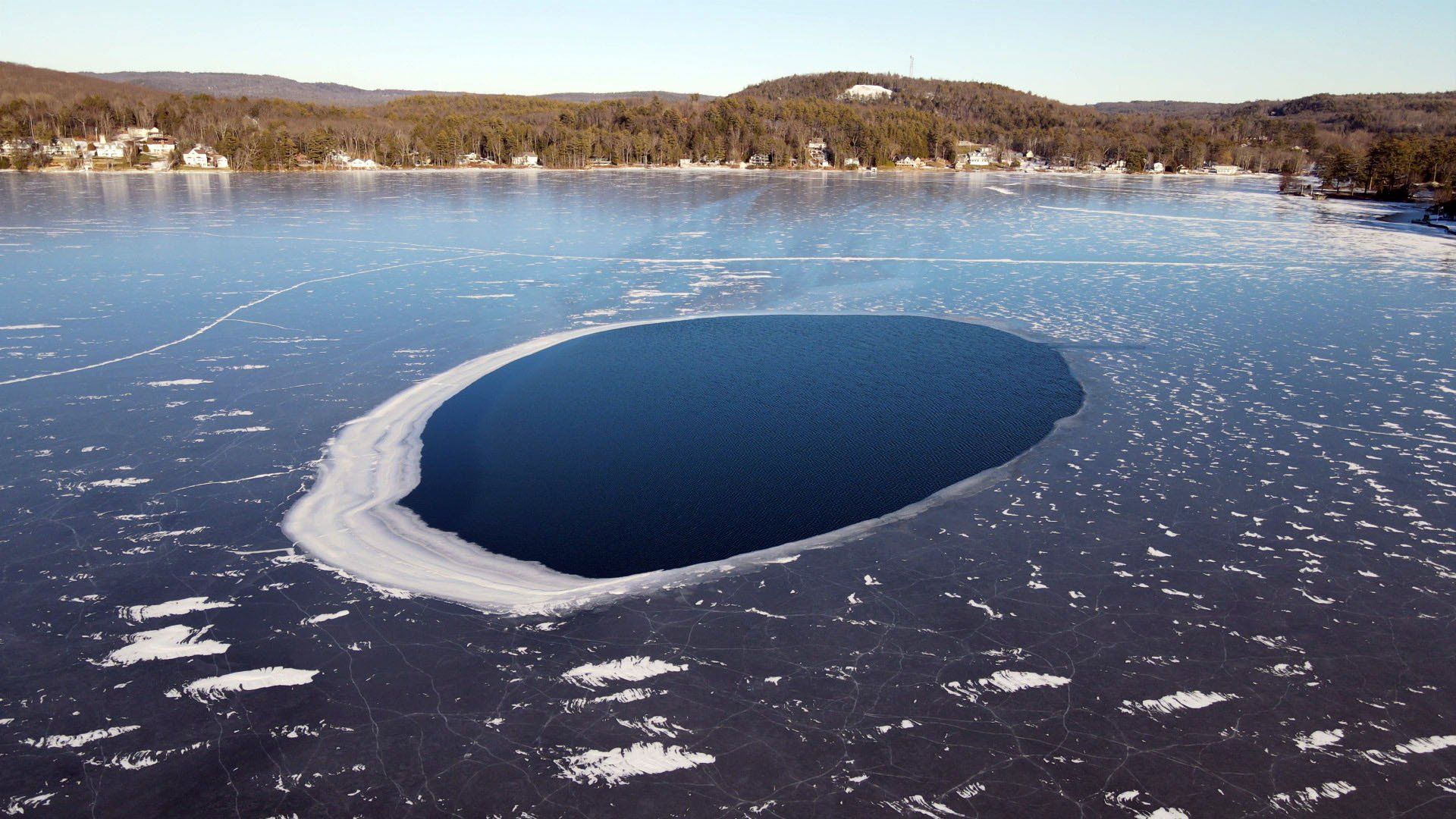 But why is the hole not freezing over? To keep an open area in the ice, the warmer water below must be reaching the surface. There are several possible reasons for this: turbulent currents, decomposition bubbles from decaying organic matter driving warmer water to the surface, or an increase in groundwater flow forcing the warmer bottom water upward.