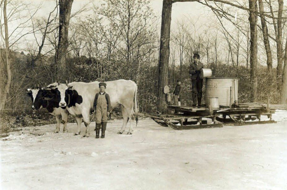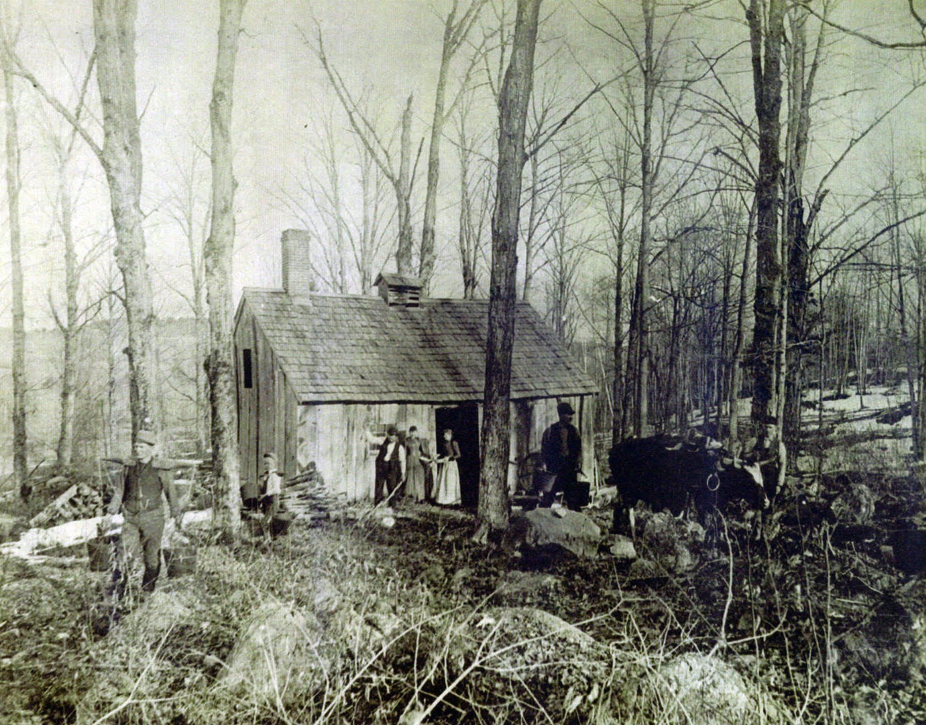 Sugaring off, or the production of maple syrup, is an ancient tradition. Native Americans gashed trees, collected the sap in wooden troughs or bark bowls. The sap was allowed to partially freeze to concentrate the sugar and was then boiled down by dropping heated stones into the liquid. This produced sugar cakes which were easy to transport and store.
