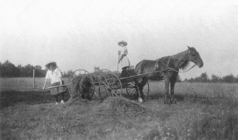 Haying was quite an exciting but anxious time. The weather had to be just right so the cut hay could dry in the sun properly. Afterward, it was raked into neat rows. Men would toss the hay from the rows onto the hay wagon for transport to the barn. Gladys eventually learned how to drive the horse drawn hay rake which was a great point of pride. The fact she earned money for it made her summers happy and profitable.
