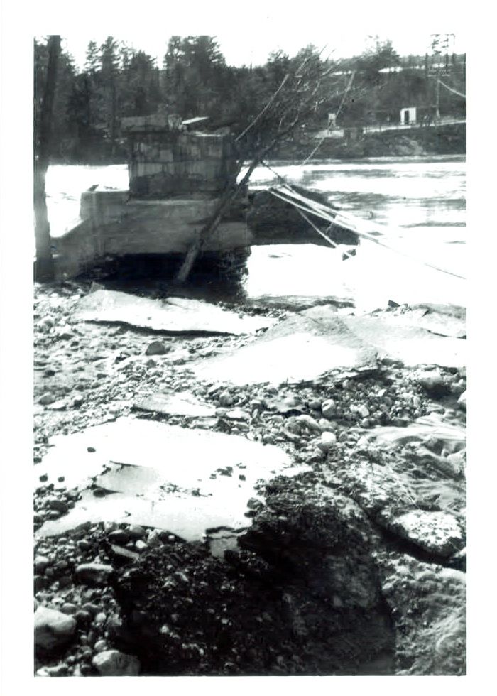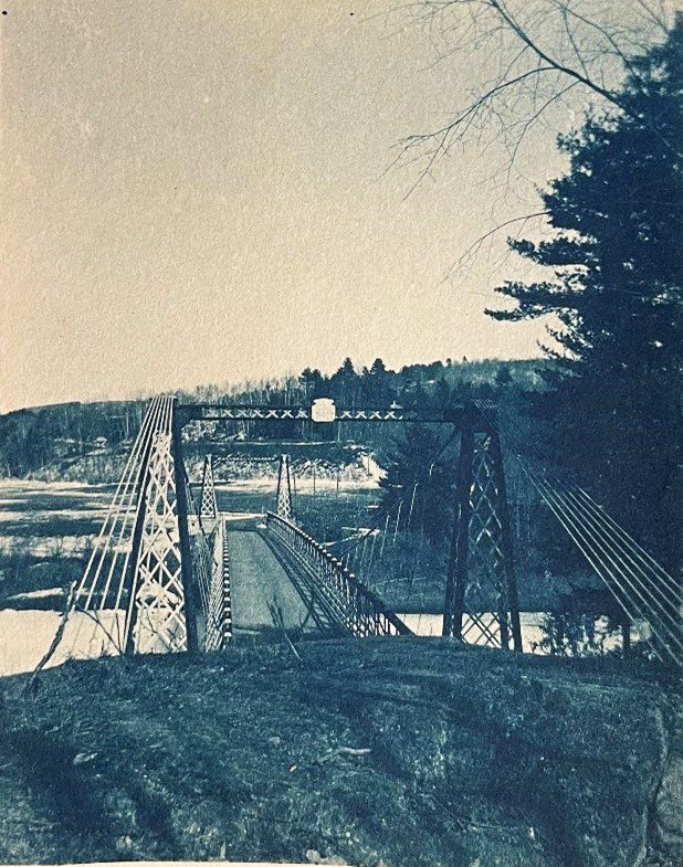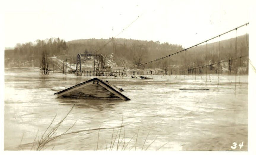 Meanwhile the water backup at the Bellows Falls Dam had flooded all of Springfield, VT. Releasing more water would have caused catastrophic damage to the already flooded Brattleboro, so the power company refused to open its gates. On March 16th, rain began again and continued for two more days. The road on the island between Hinsdale and Brattleboro disappeared. Only a few treetops noted its location. Finally on March 19th, the Chesterfield's 1889 suspension bridge lost its battle with the river.