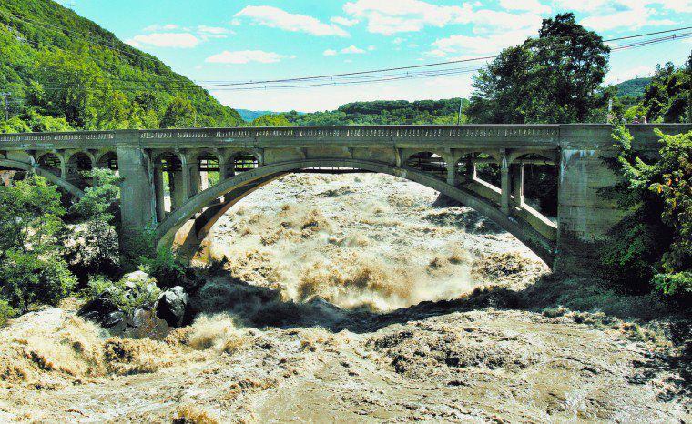According to the National Weather Service in Gray, ME (which covers NH and the CT River), the 1936 Flood is still the historic high for the Connecticut River. The river reached an astounding 43.5 feet. The second highest was during the hurricane of 1938, when it reached 39.1 feet. During Tropical Storm Irene in 2011, it only reached 31.3 feet. To put it into perspective, this the Bellows Falls Bridge during Irene.