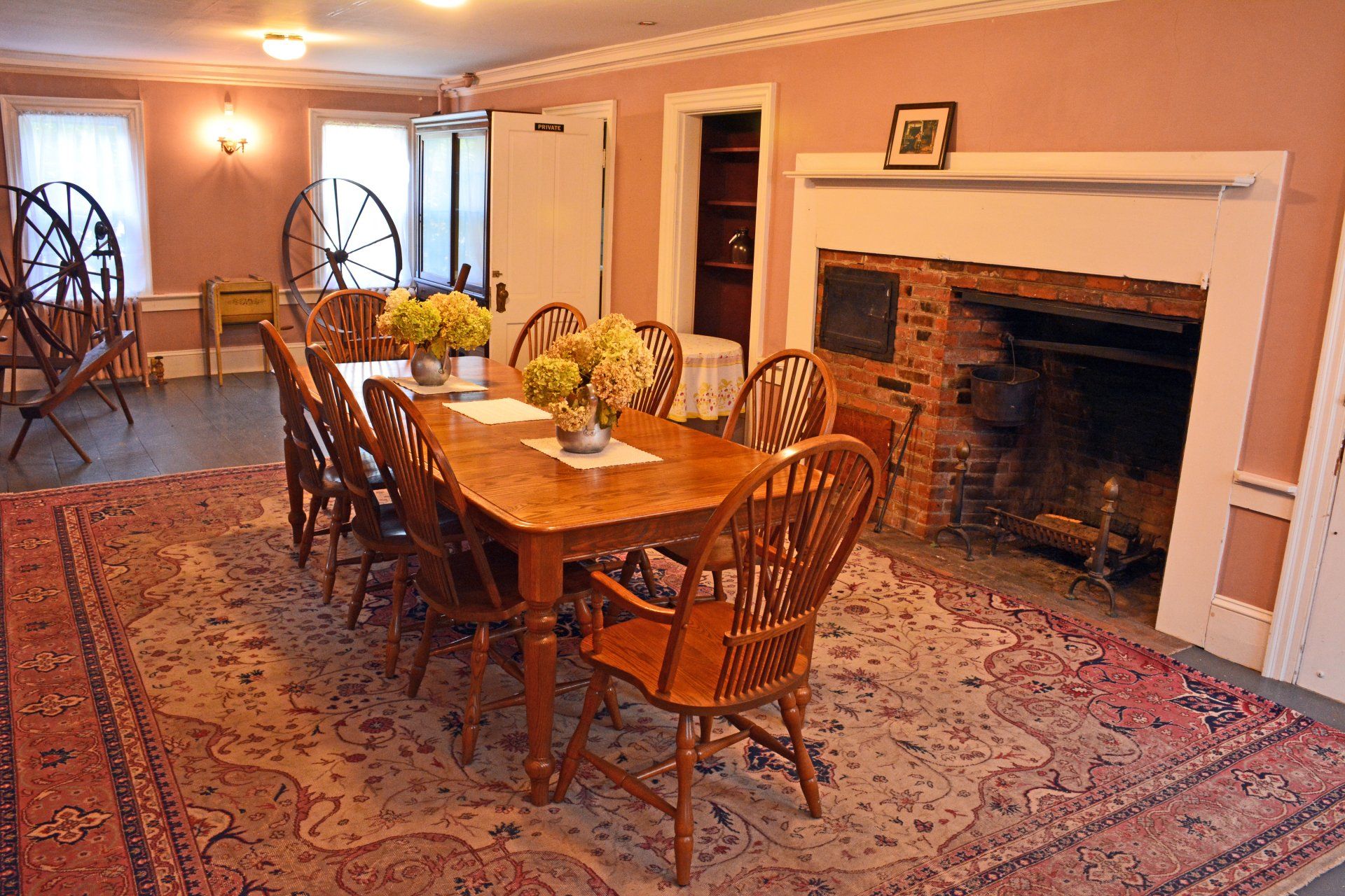 The kitchen area is located in the original wooden building, two feet below the first floor of the Stone House addition. It still retains the large, open-hearth brick fireplace with a pivoting pot hanger for cooking, a bake oven, and wooden storage bin. The fireplace is connected to a "beehive" hot-water heating stove. Large kettles full of water would rest in the oversize openings on the stove's top. The heated water would be used in all the tavern's operations.
