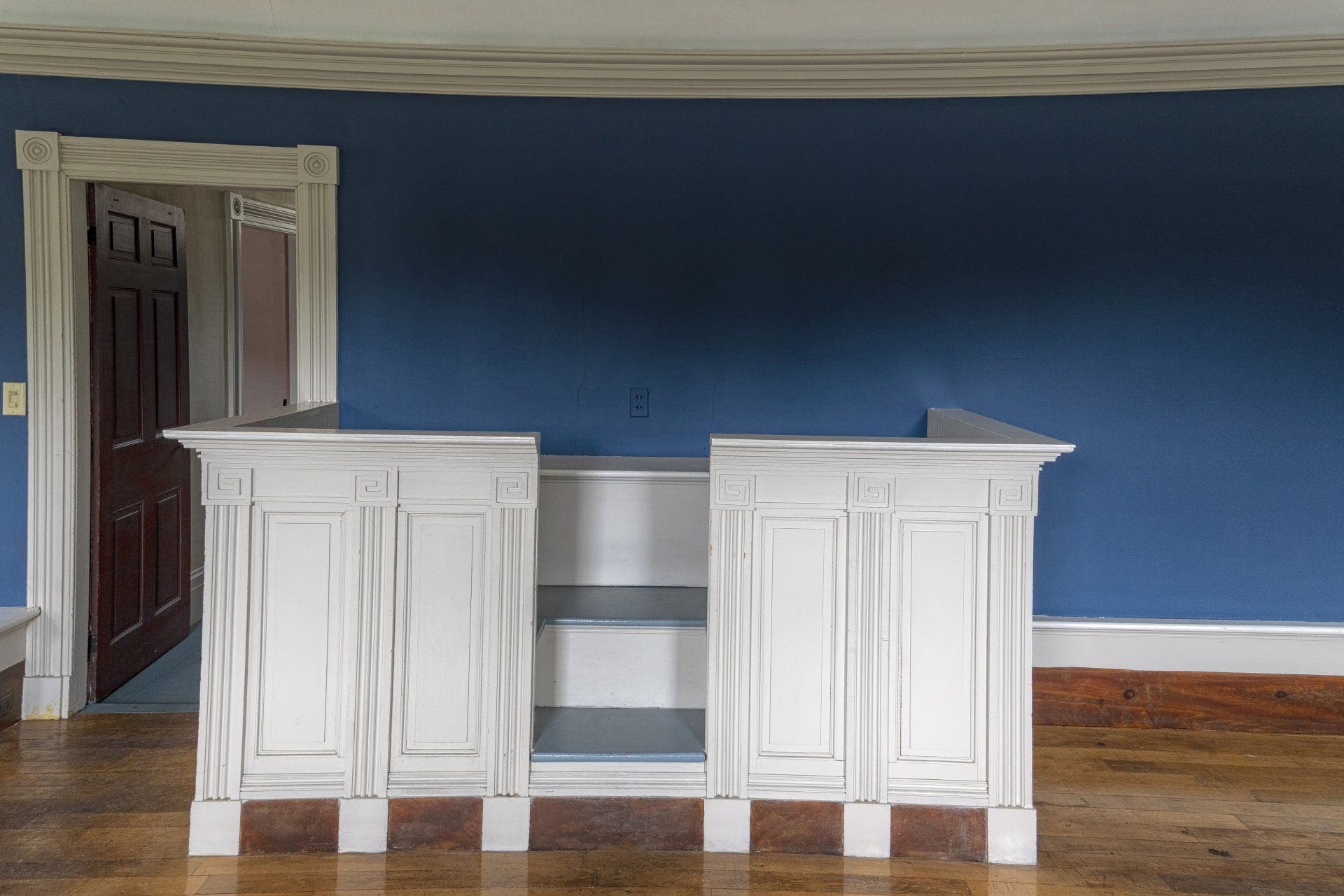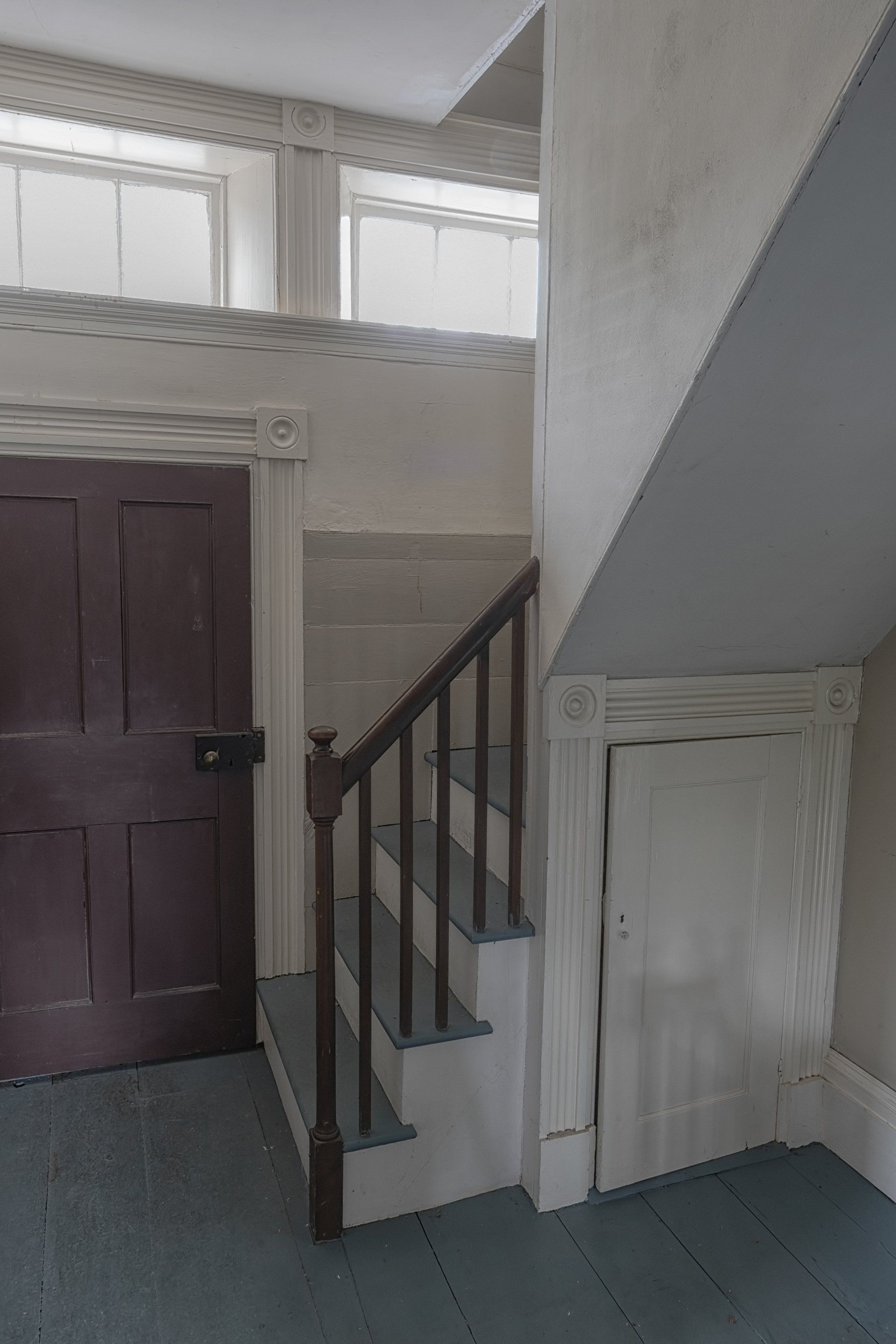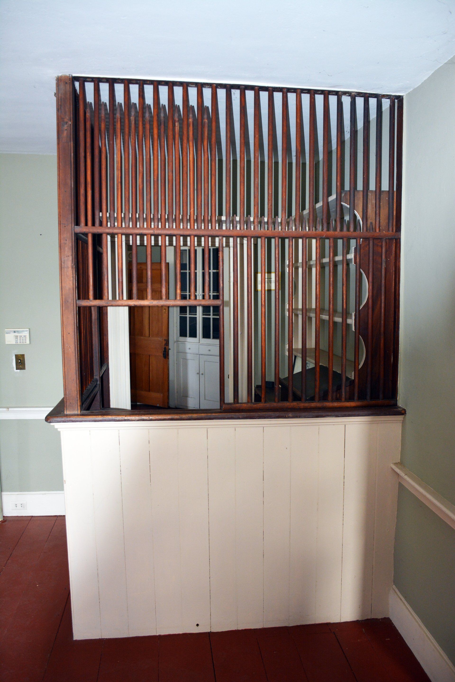 Above the ballroom is the gabled attic which contains a series of five cubicles. Each have box-like platforms containing boot holds (probably for chamber pots). Straw mattresses would be laid on the platforms to provide Spartan accommodations for the stage drivers, drovers, or travelers on a tight budget. The cubicles were designed with openings for cross ventilation from the gables windows. These openings still have their blown glass features. Originally this area was not heated.